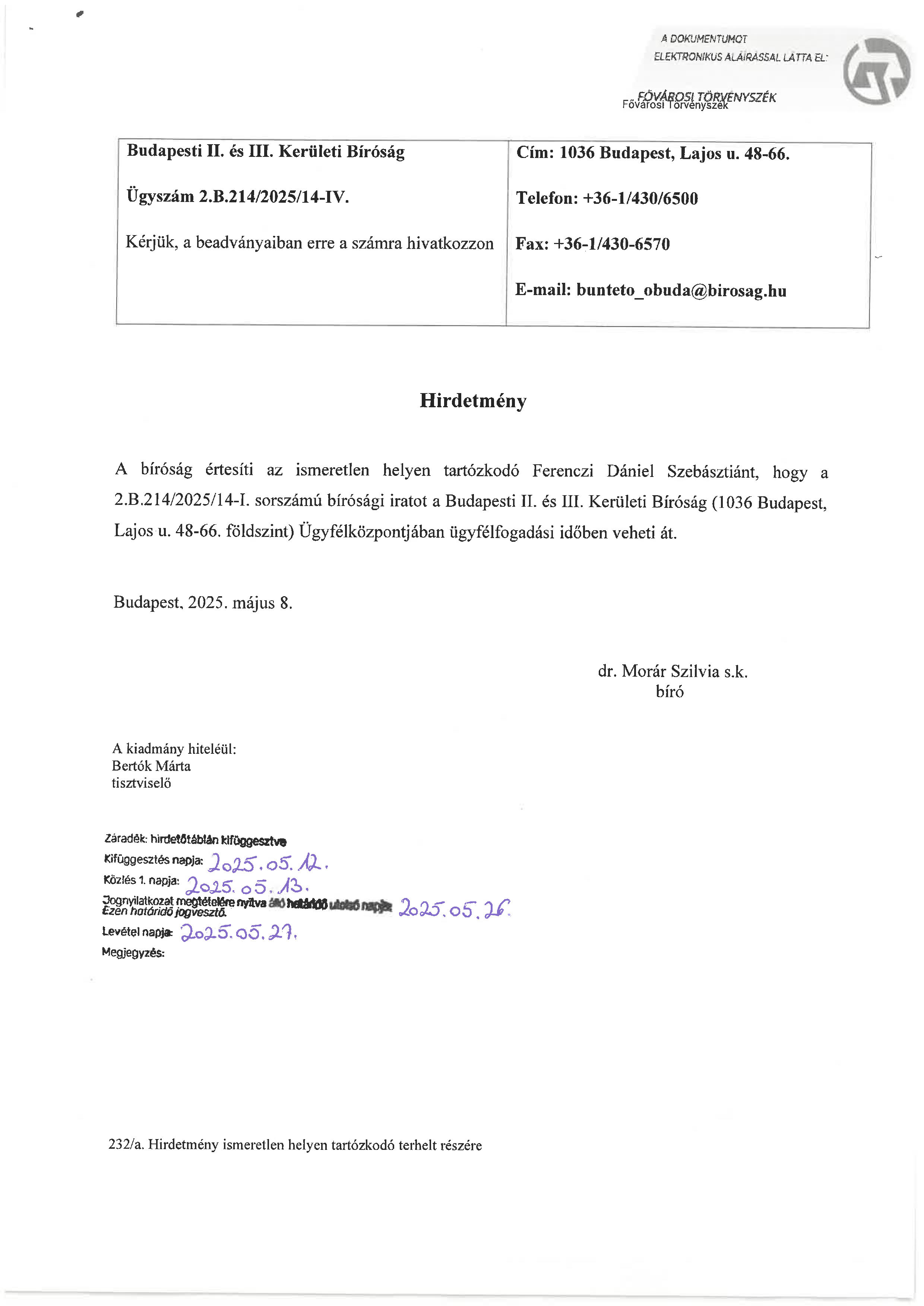 A Budapesti II. és III. Kerületi Bíróság hirdetménye
