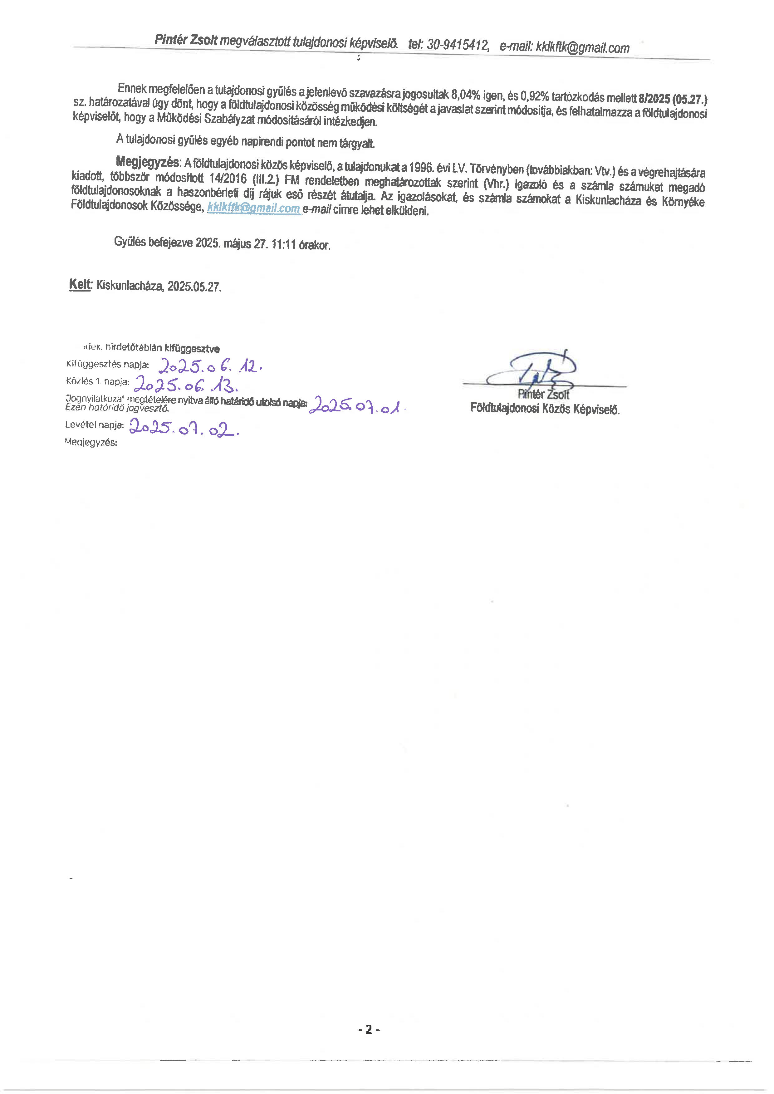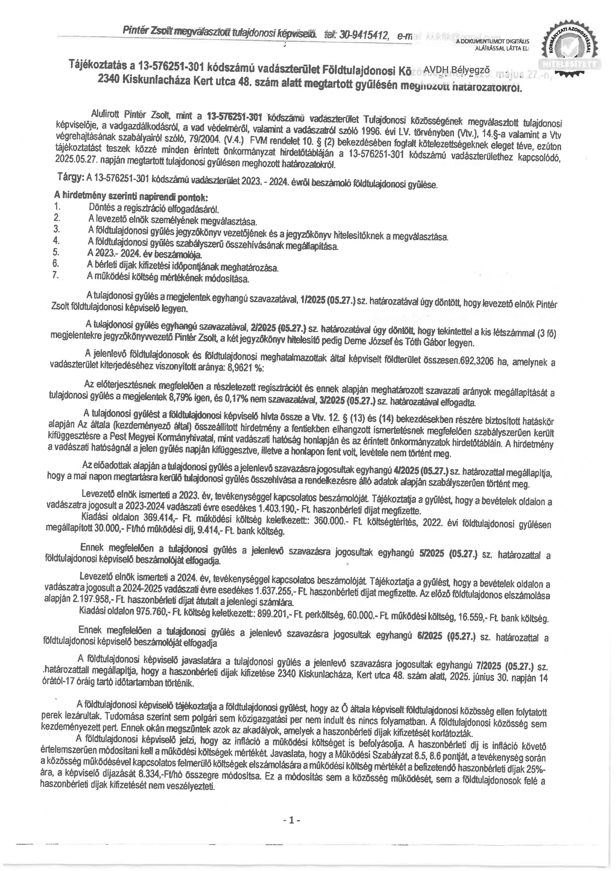 Tájékoztatás a 13-576251-301 kódszámú vadászterület Földtulajdonosi Közgyűlésen, 2340 Kiskunlacháza Kert utca 48. szám alatt megtartott gyűlésén meghozott határozatokról