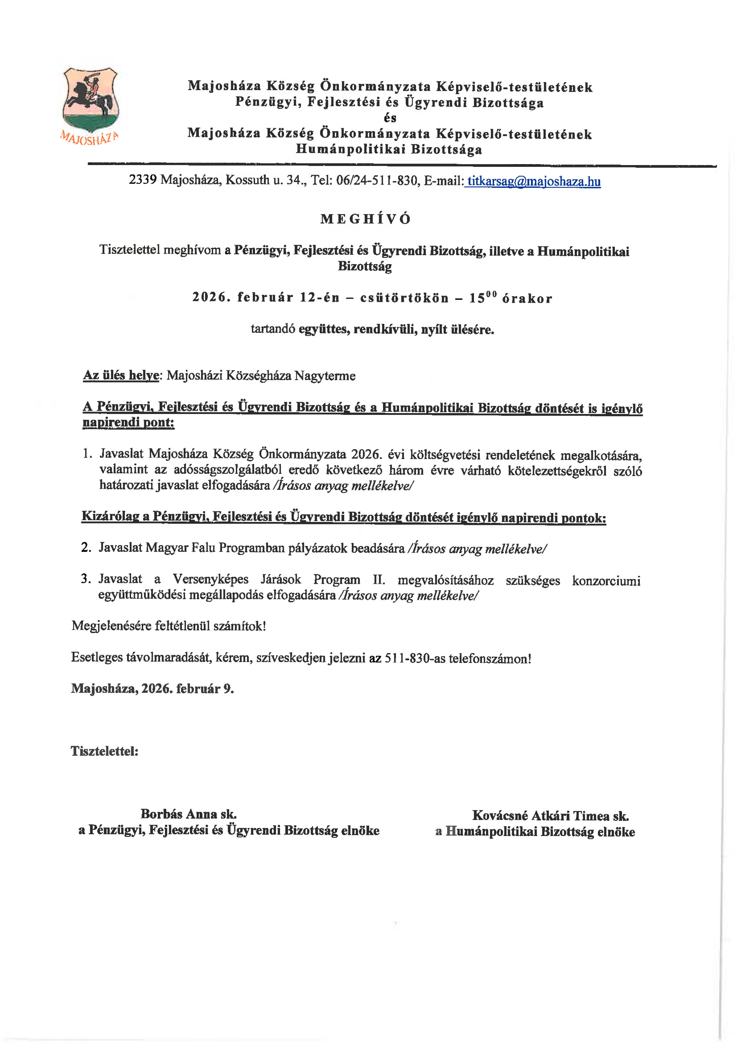 Pénzügyi, Fejlesztési és Ügyrendi Bizottság és Humánpolitikai Bizottsági együttes ülés - 2026.02.12.