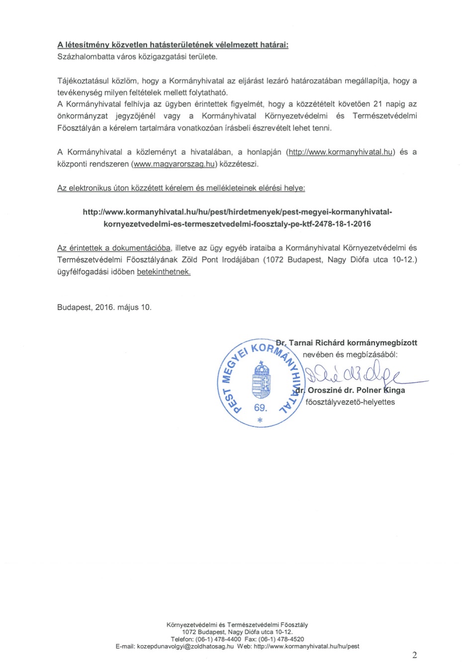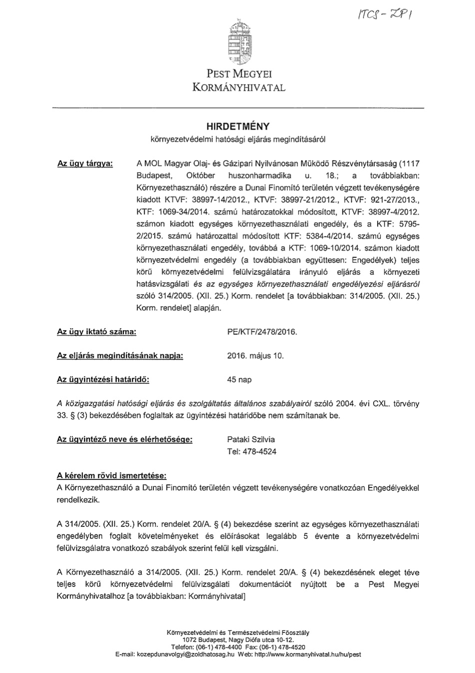 Hirdetmény környezetvédelmi hatósági eljárás megindításáról