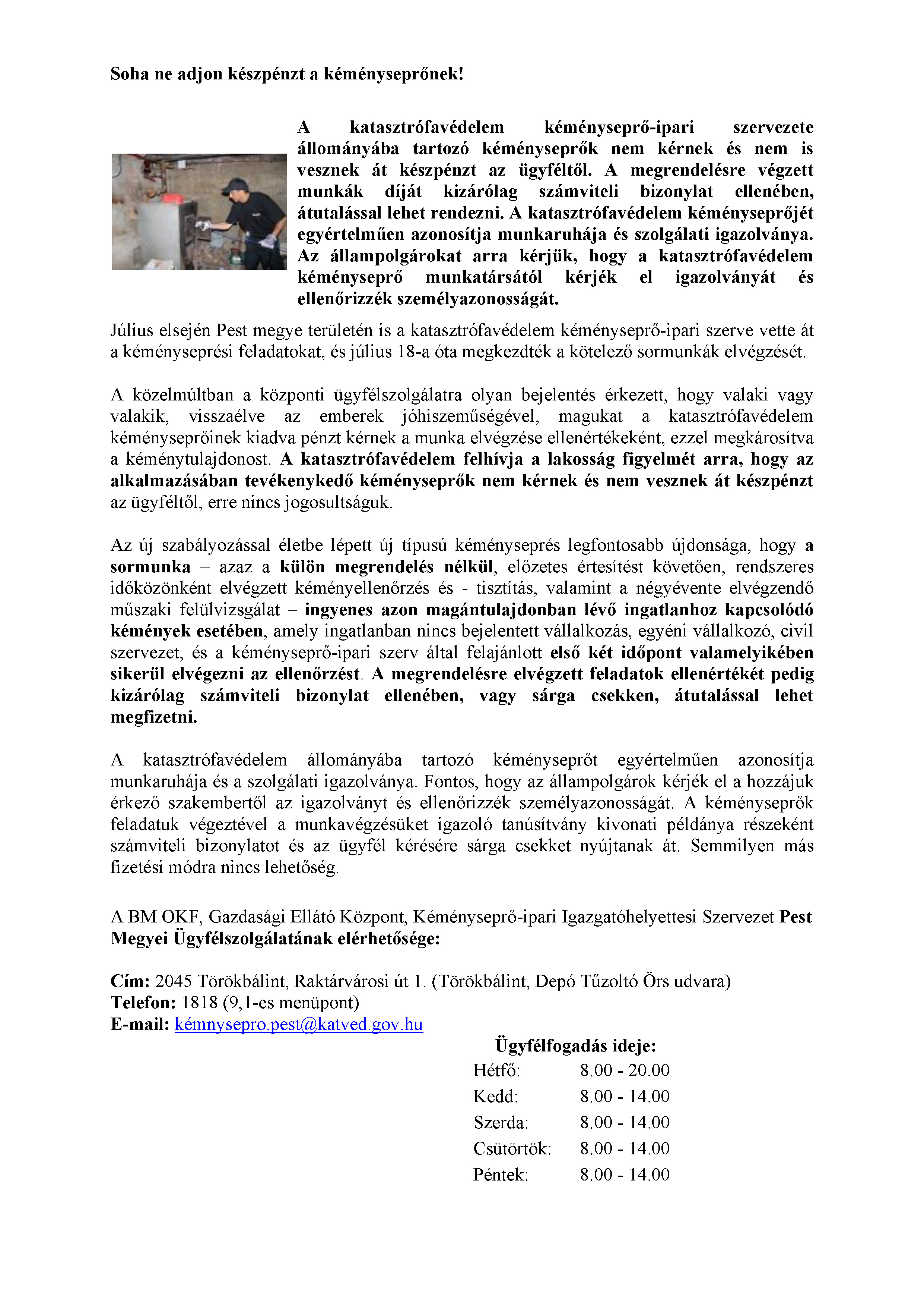 Lakossági tájékoztató - Soha ne adjon készpénzt a kéményseprőnek!