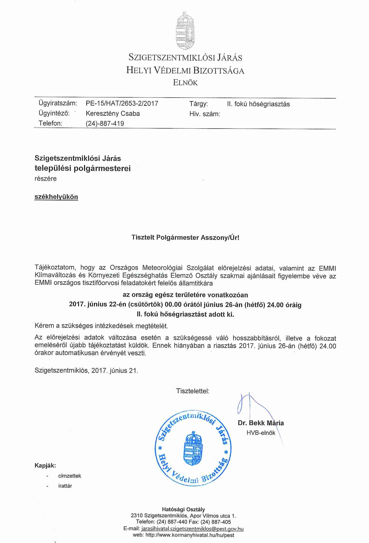 II. fokú hőségriasztás - 2017. június 22.