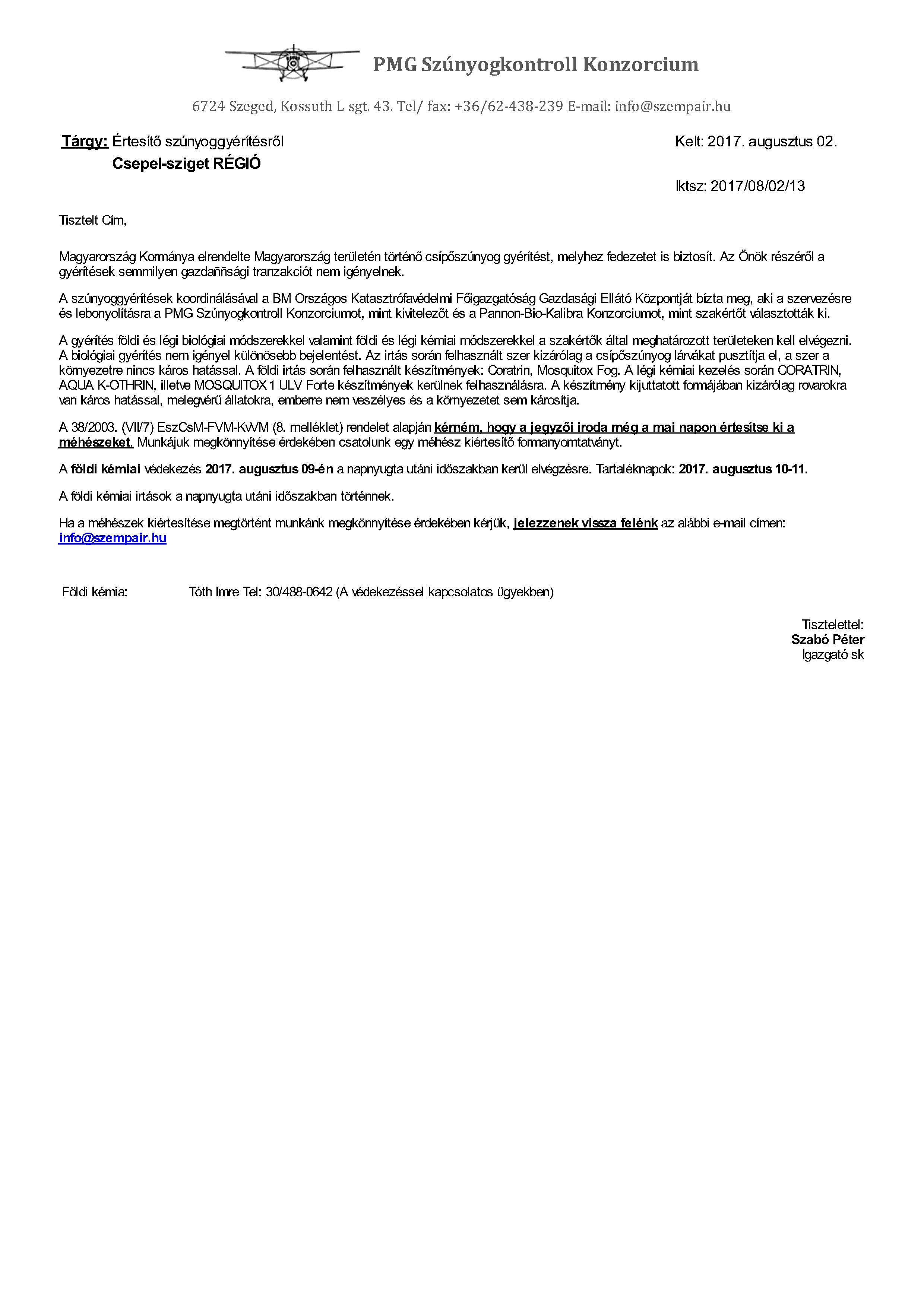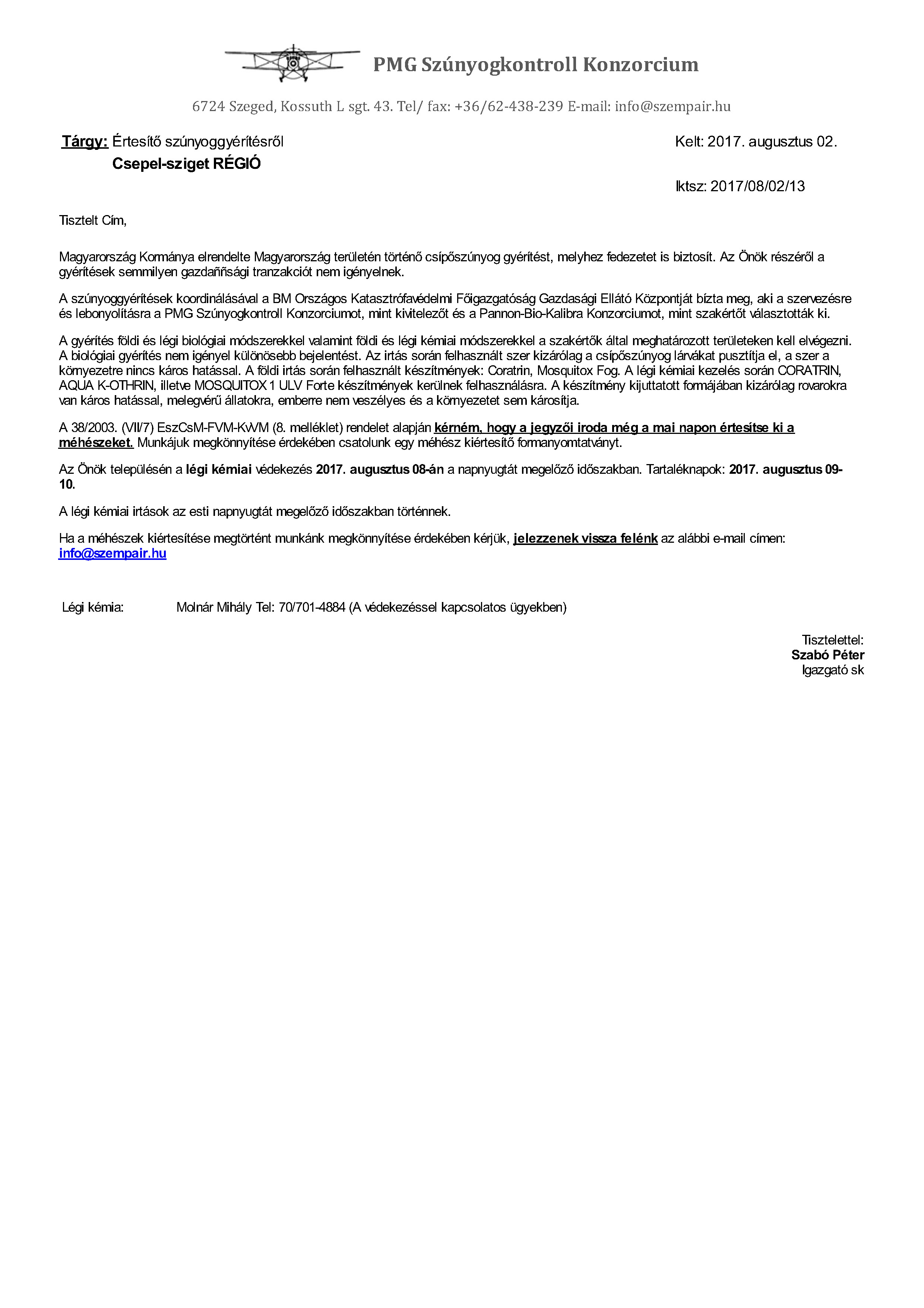 Értesítés légi és földi szúnyoggyérítésről - 2017. augusztus