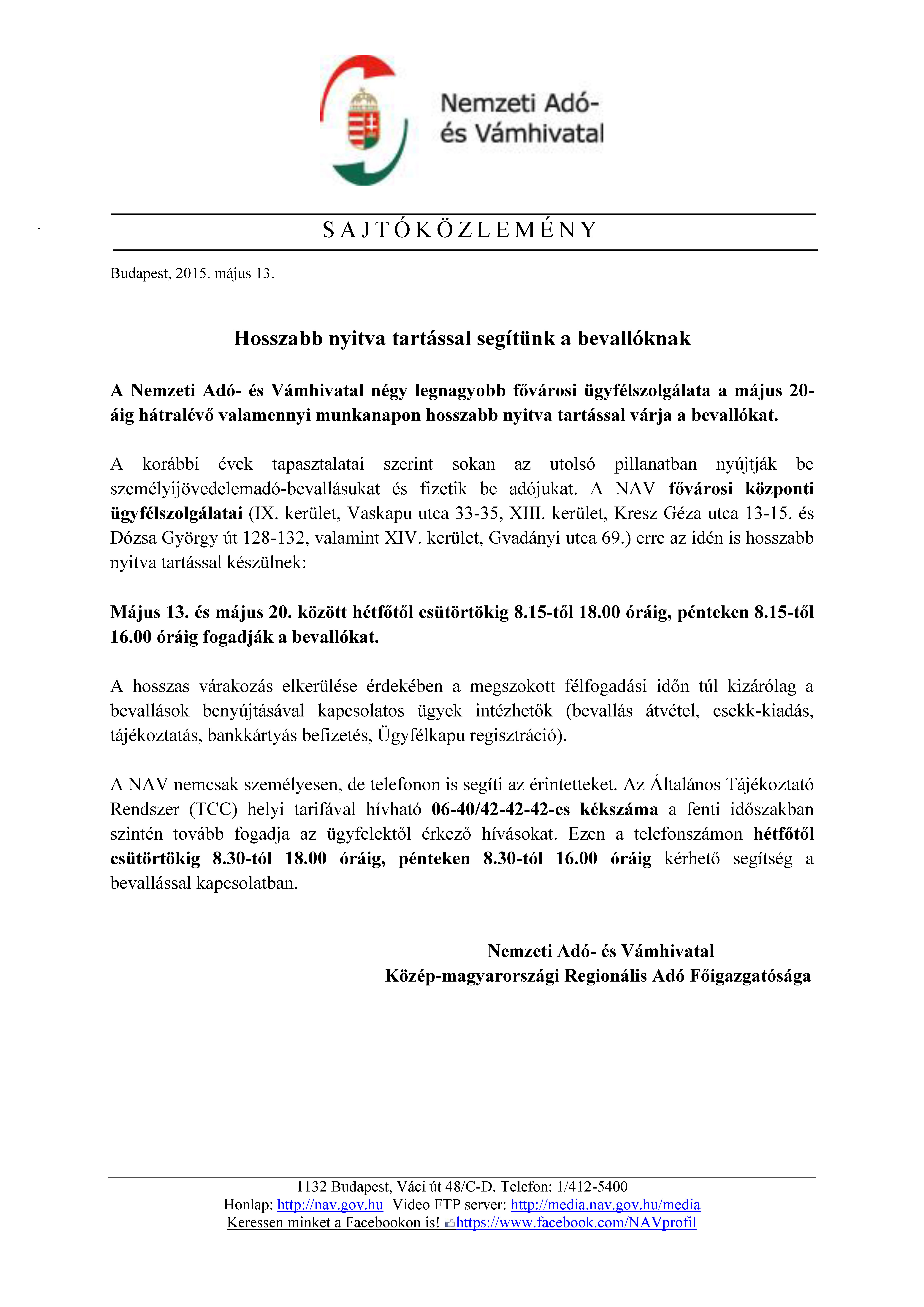 NAV közlemény - hosszabb nyitvatartás a bevallóknak