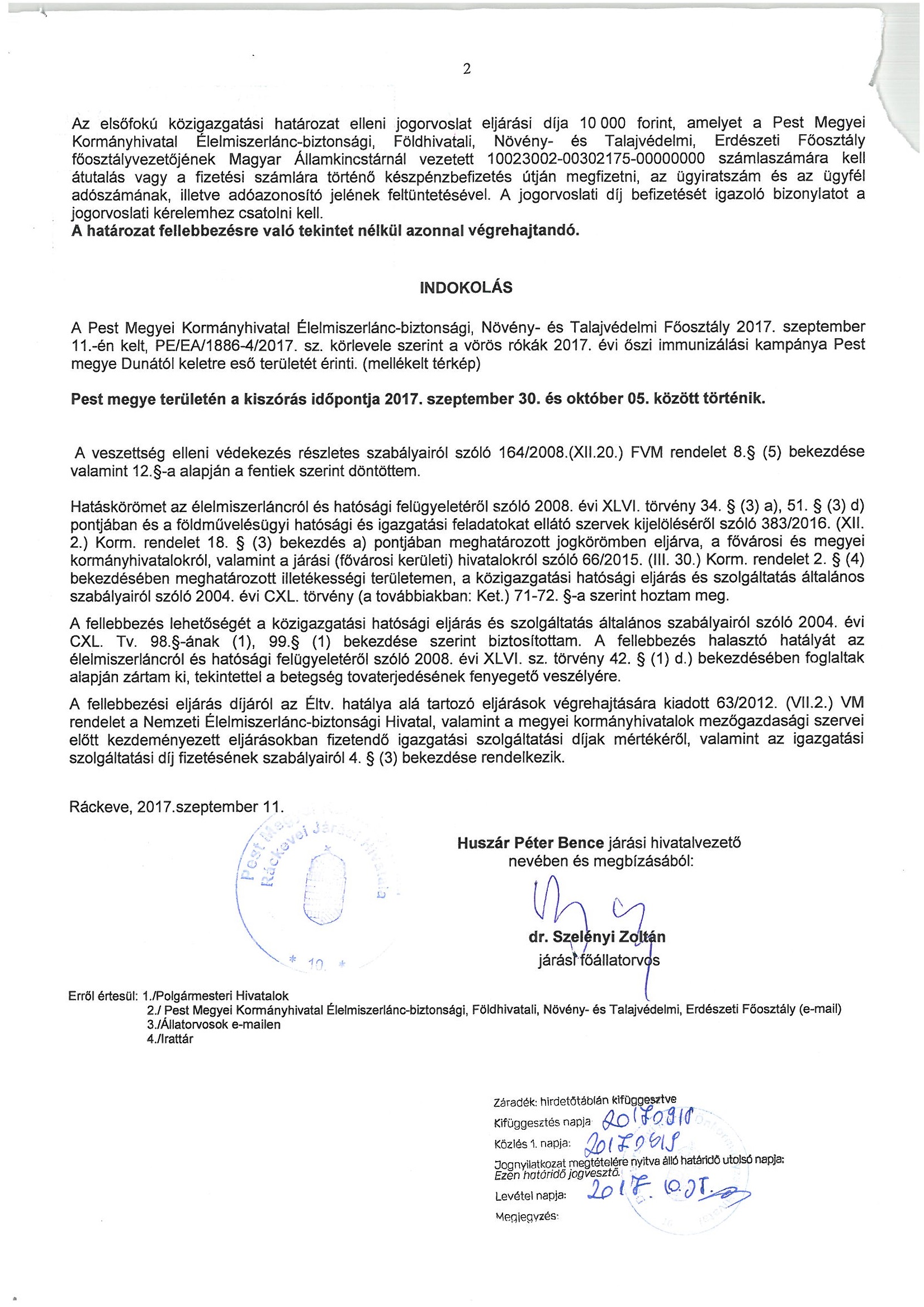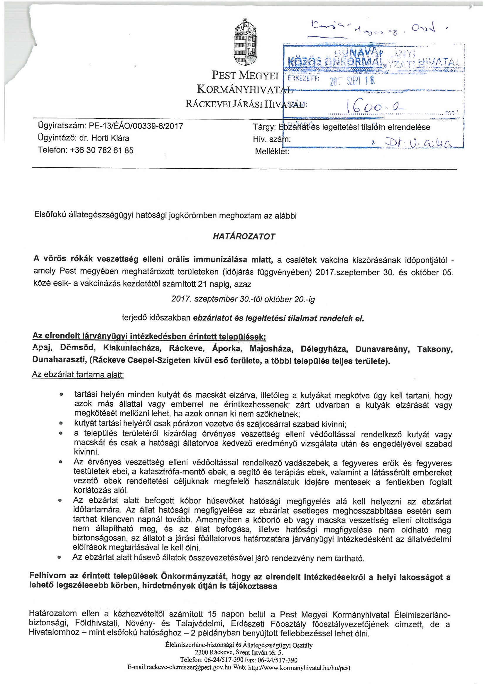 Ebzárlat és legeltetési tilalom - 2017. szeptember 30. - október 20.
