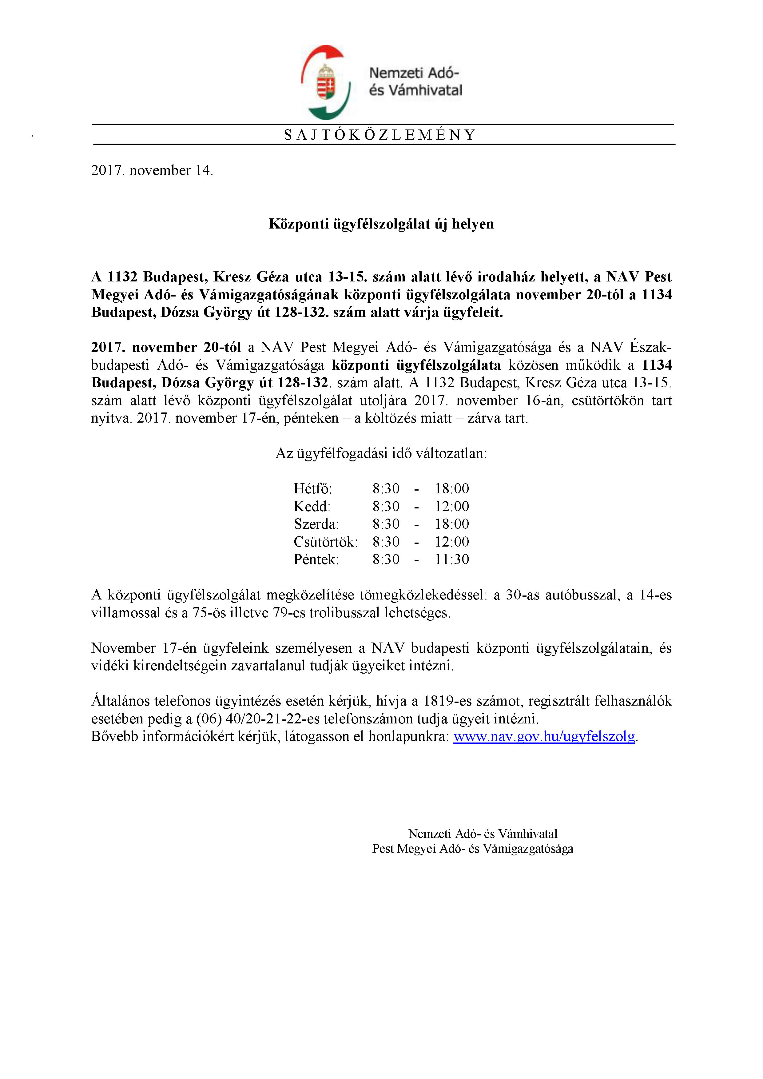 NAV közlemény - Központi ügyfélszolgálat új helyen