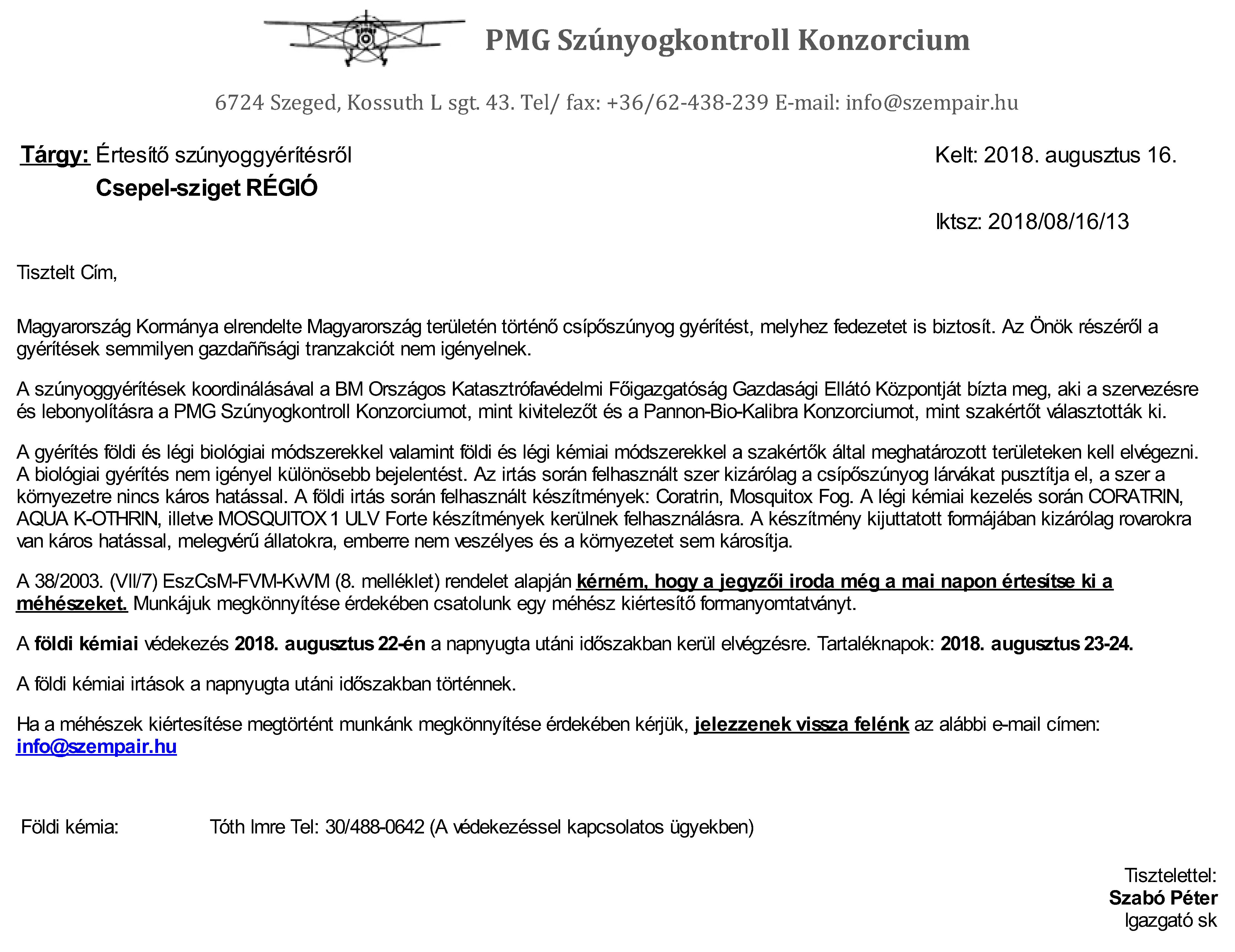 Értesítő földi kémiai szúnyoggyérítésről - 2018. augusztus 22.