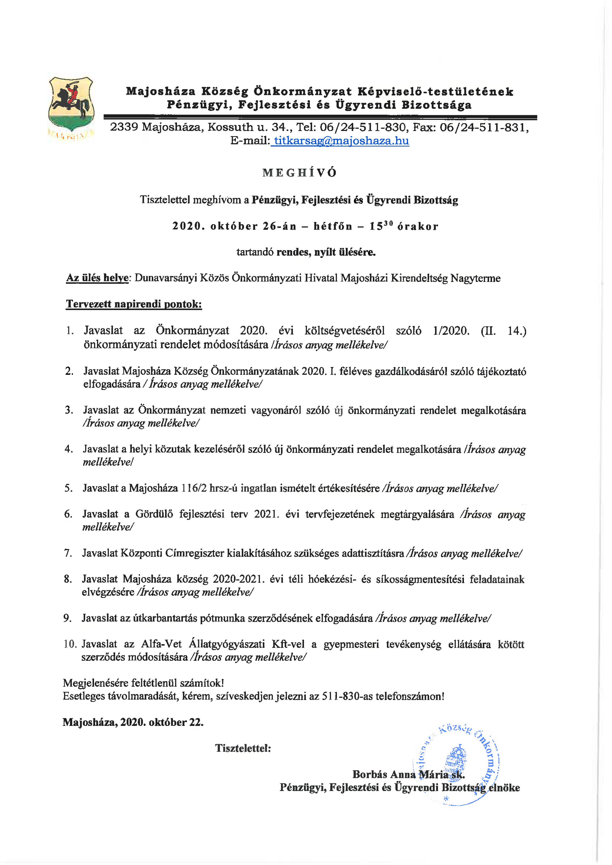 Pénzügyi, Fejlesztési és Ügyrendi Bizottság ülés - 2020. október 26.