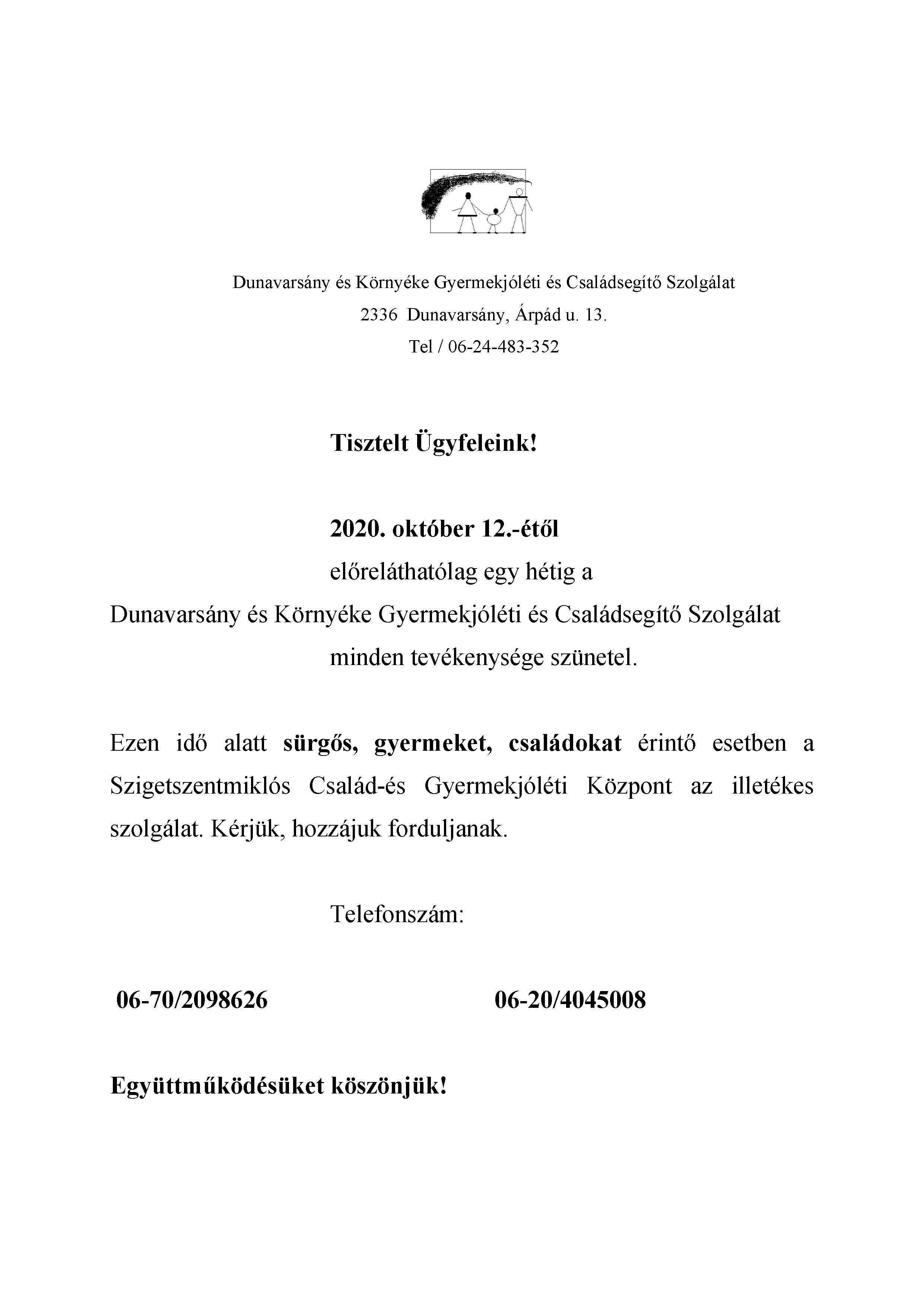 A Dunavarsány és Környéke Gyermekjóléti és Családsegítő Szolgálat tevékenysége szünetel