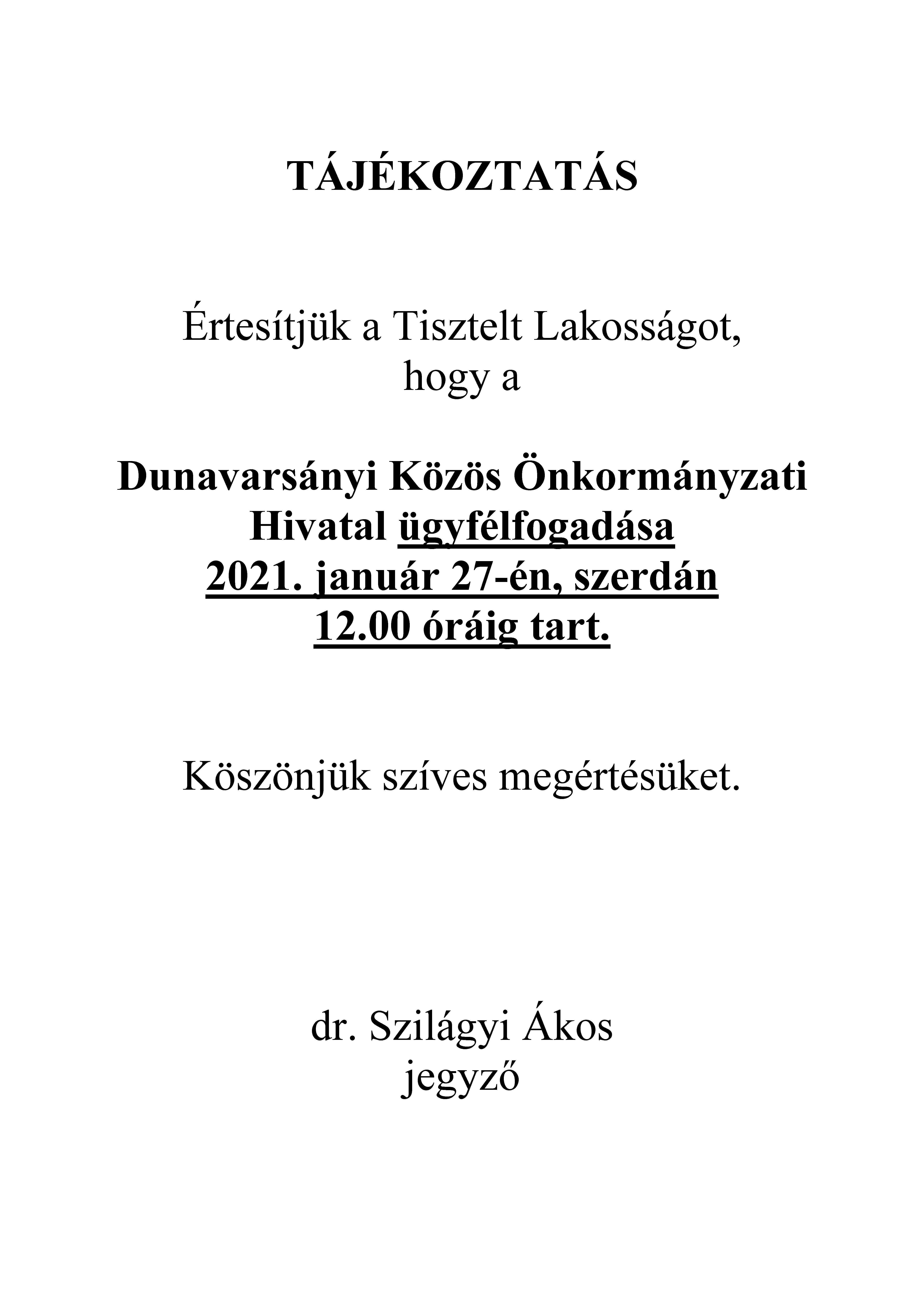 Tájékoztatás - Nyitvatartás változás 2021. 01. 27.