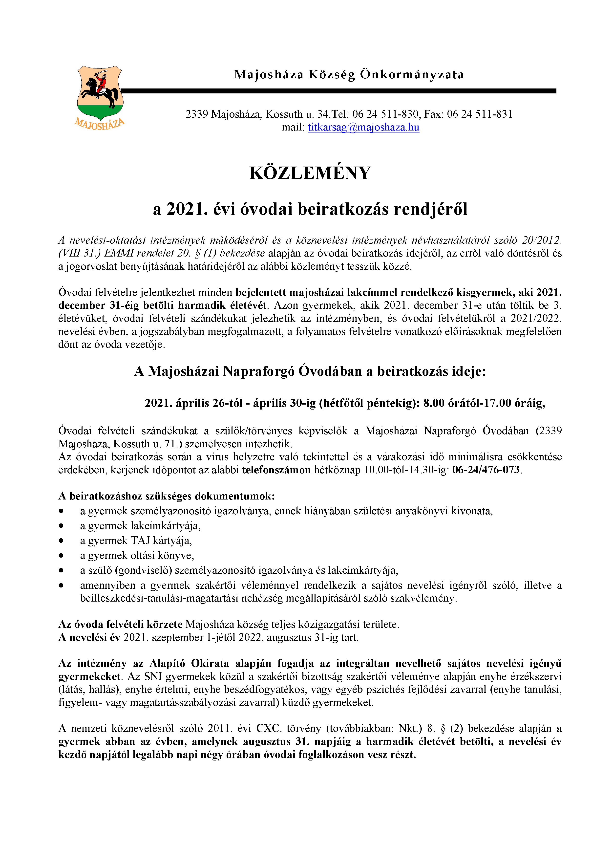 Óvodai beiratkozás 2021. április 26. és április 30. között