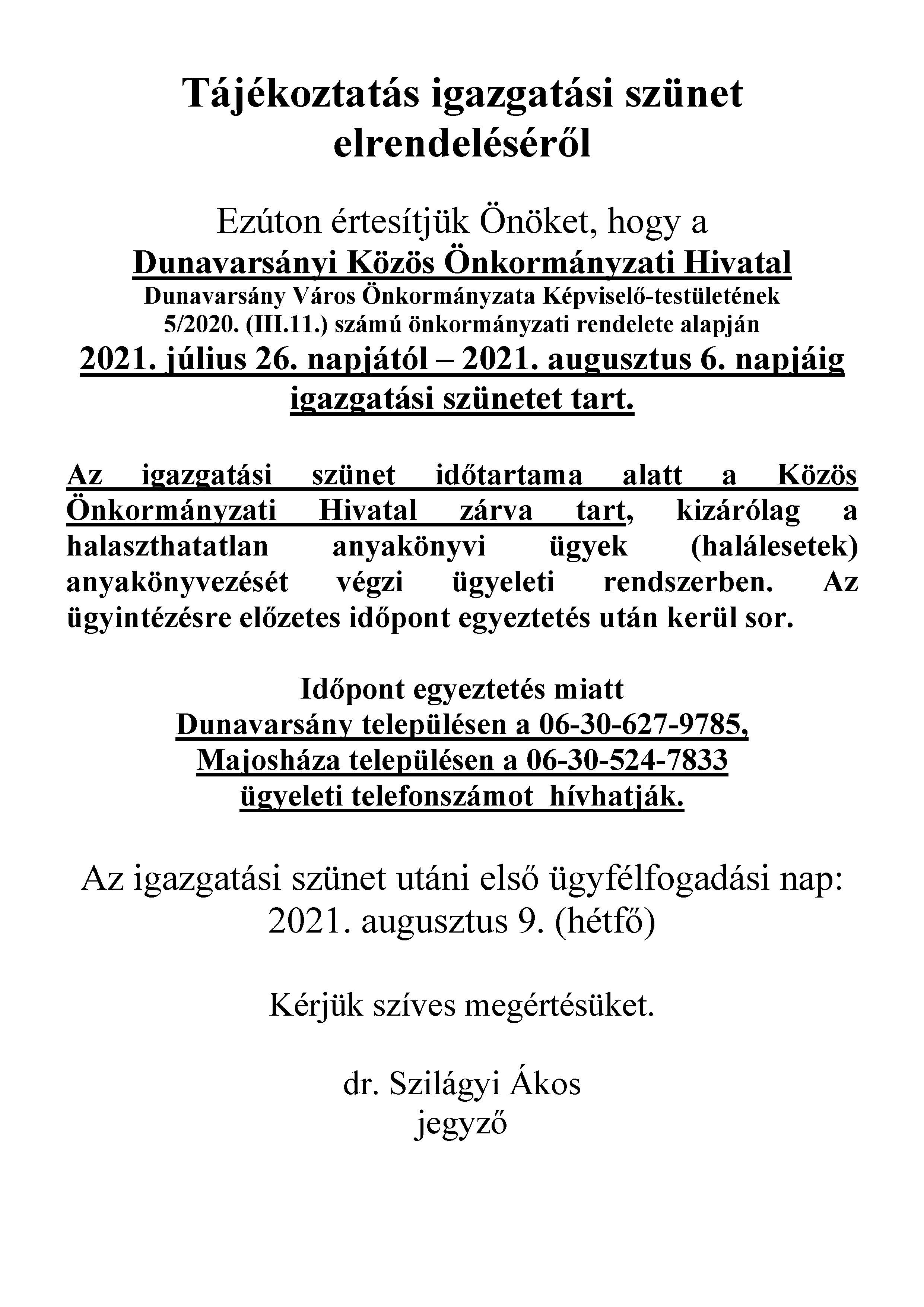 Igazgatási szünet 2021.07.26-2021.08.06.