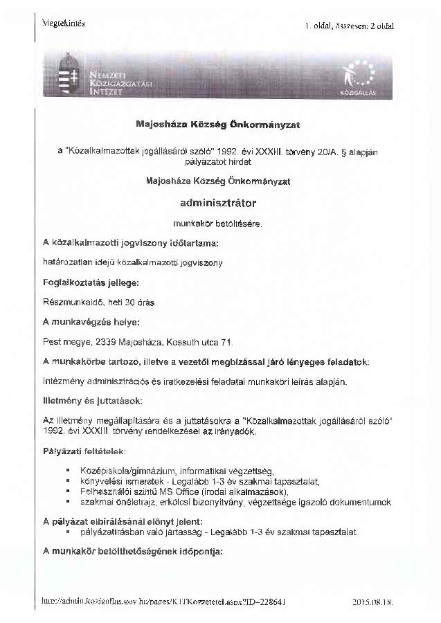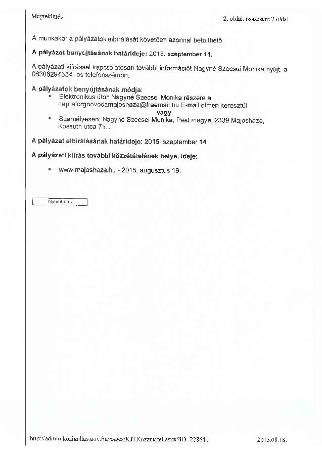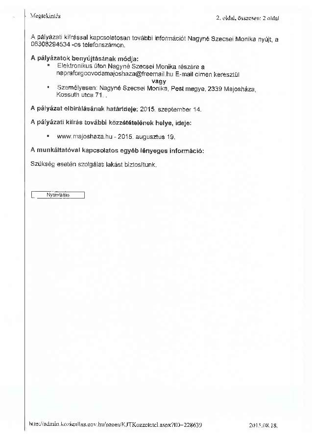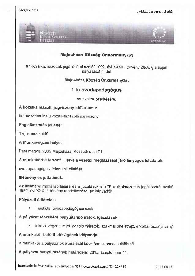 Pályázat 1 fő óvodapedagógus munkakör betöltésére