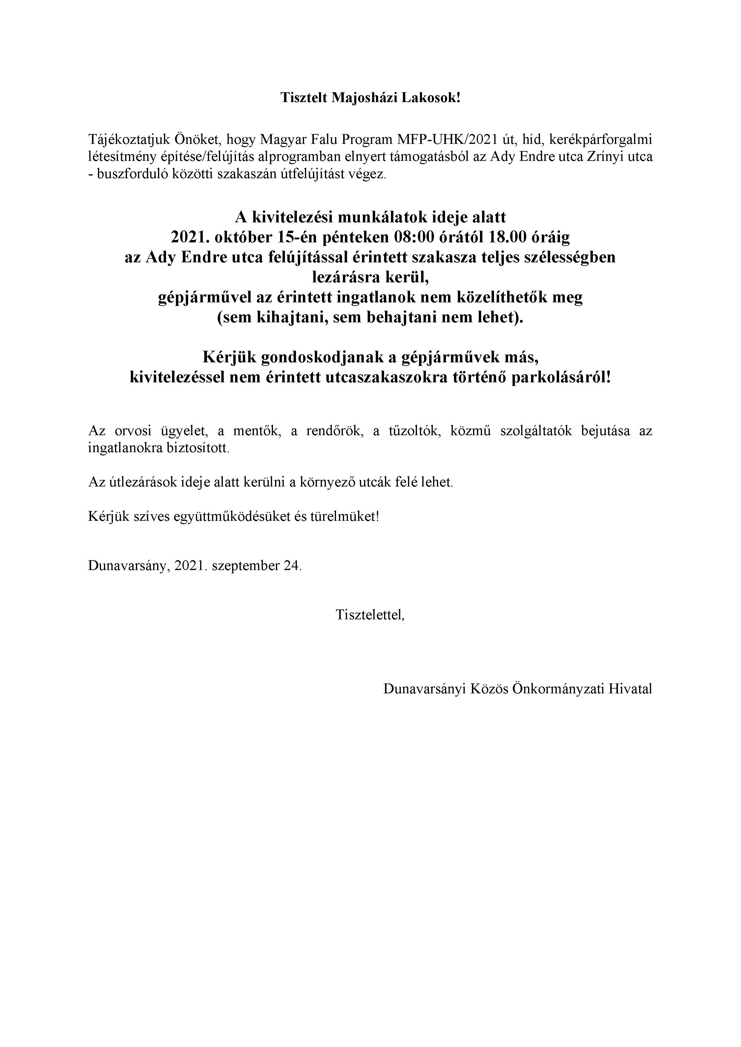 Lakossági tájékoztató - Az Ady Endre utca felújítással érintett szakasza teljes szélességben lezárásra kerül 2021. október 15-én pénteken 08:00 órától 18.00 óráig