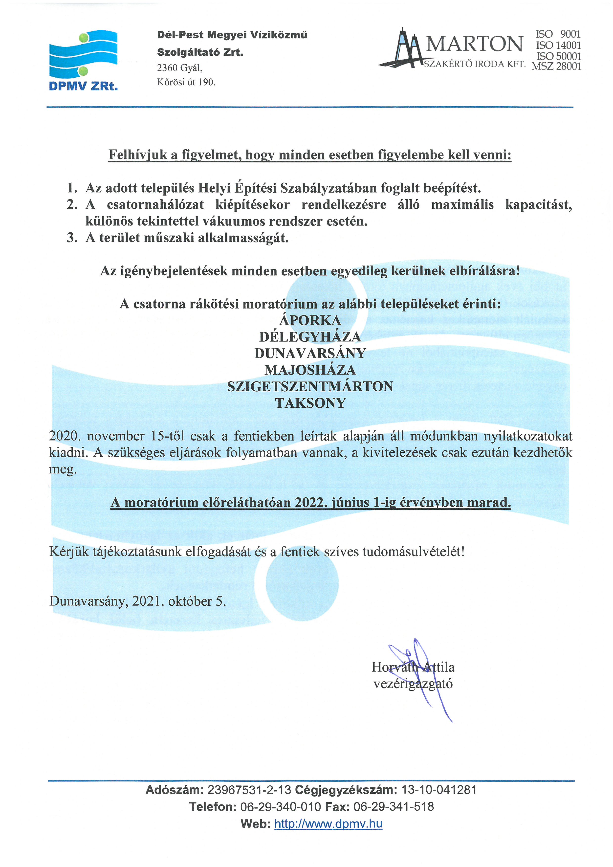 Tájékoztatás csatorna rákötési moratóriumról