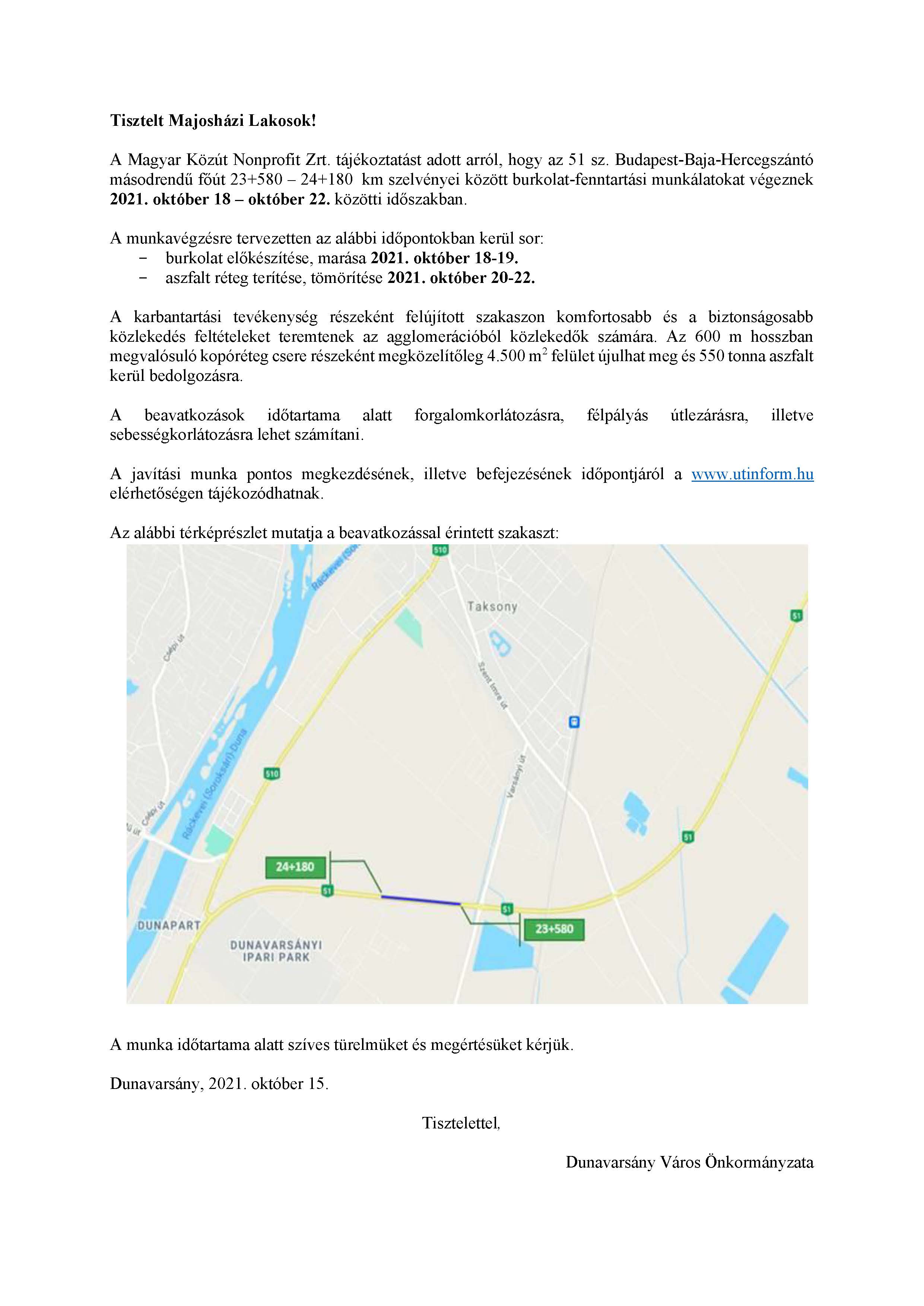 Tájékoztatás - 51 sz. főút (Taksony / Dunavarsány) burkolatfelújítása
