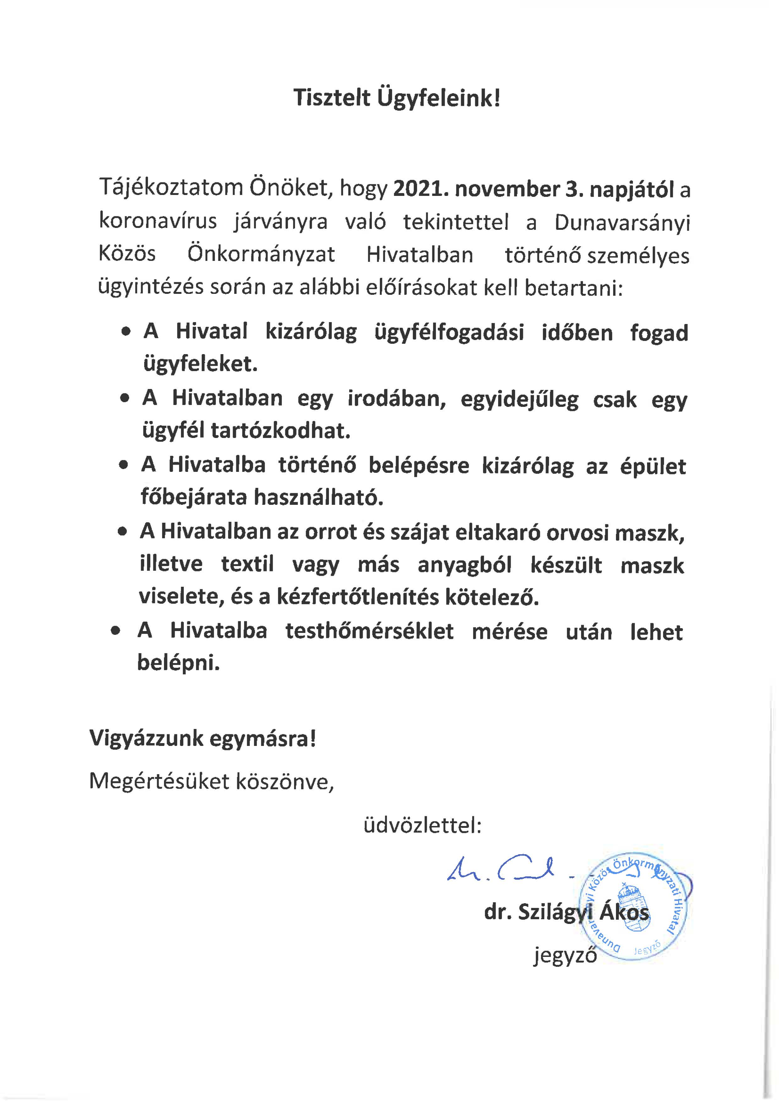 Járványügyi előírások a Közös Önkormányzati Hivatalban 2021. november 3-tól