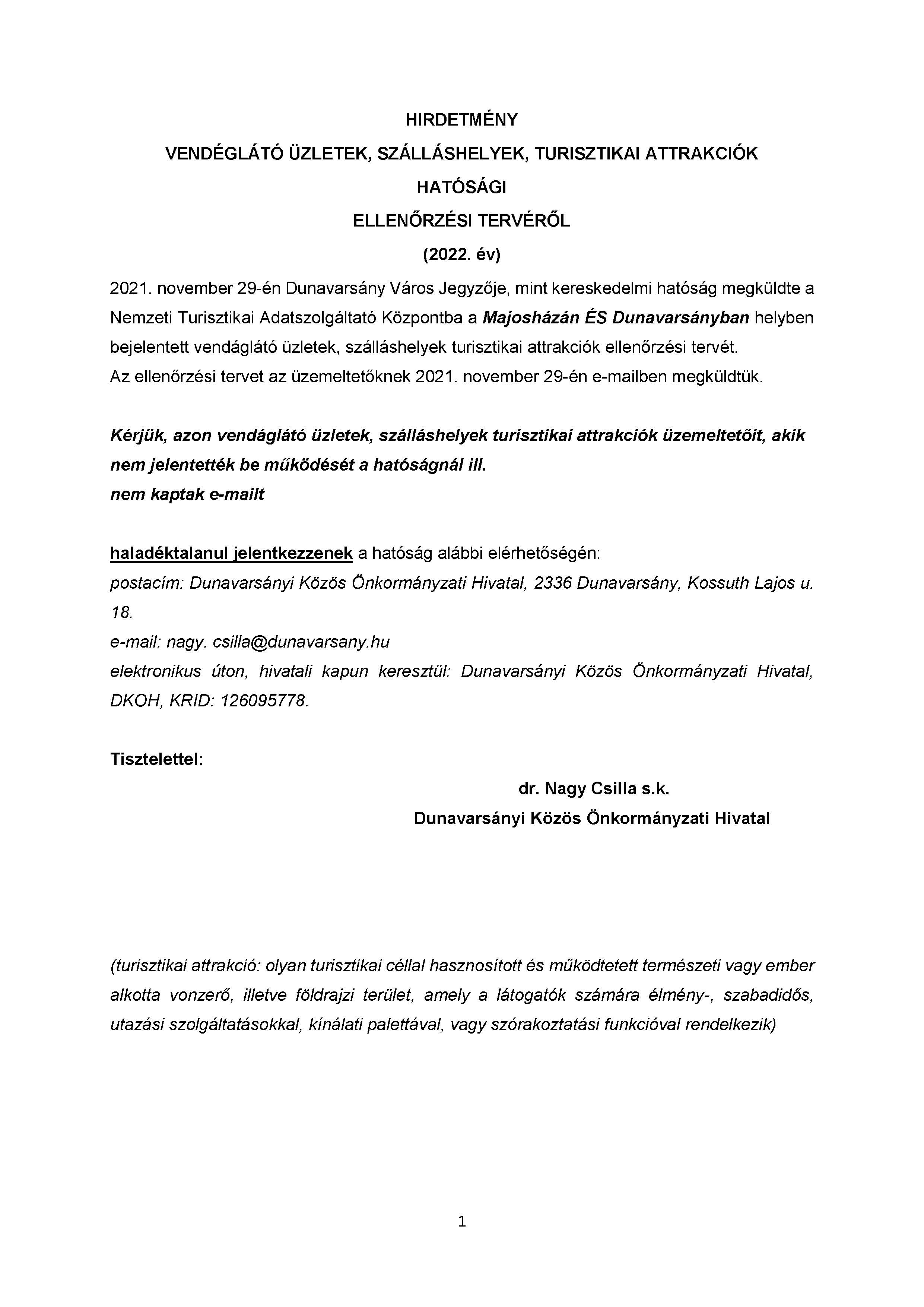 HIRDETMÉNY VENDÉGLÁTÓ ÜZLETEK, SZÁLLÁSHELYEK, TURISZTIKAI ATTRAKCIÓK HATÓSÁGI ELLENŐRZÉSI TERVÉRŐL 2022