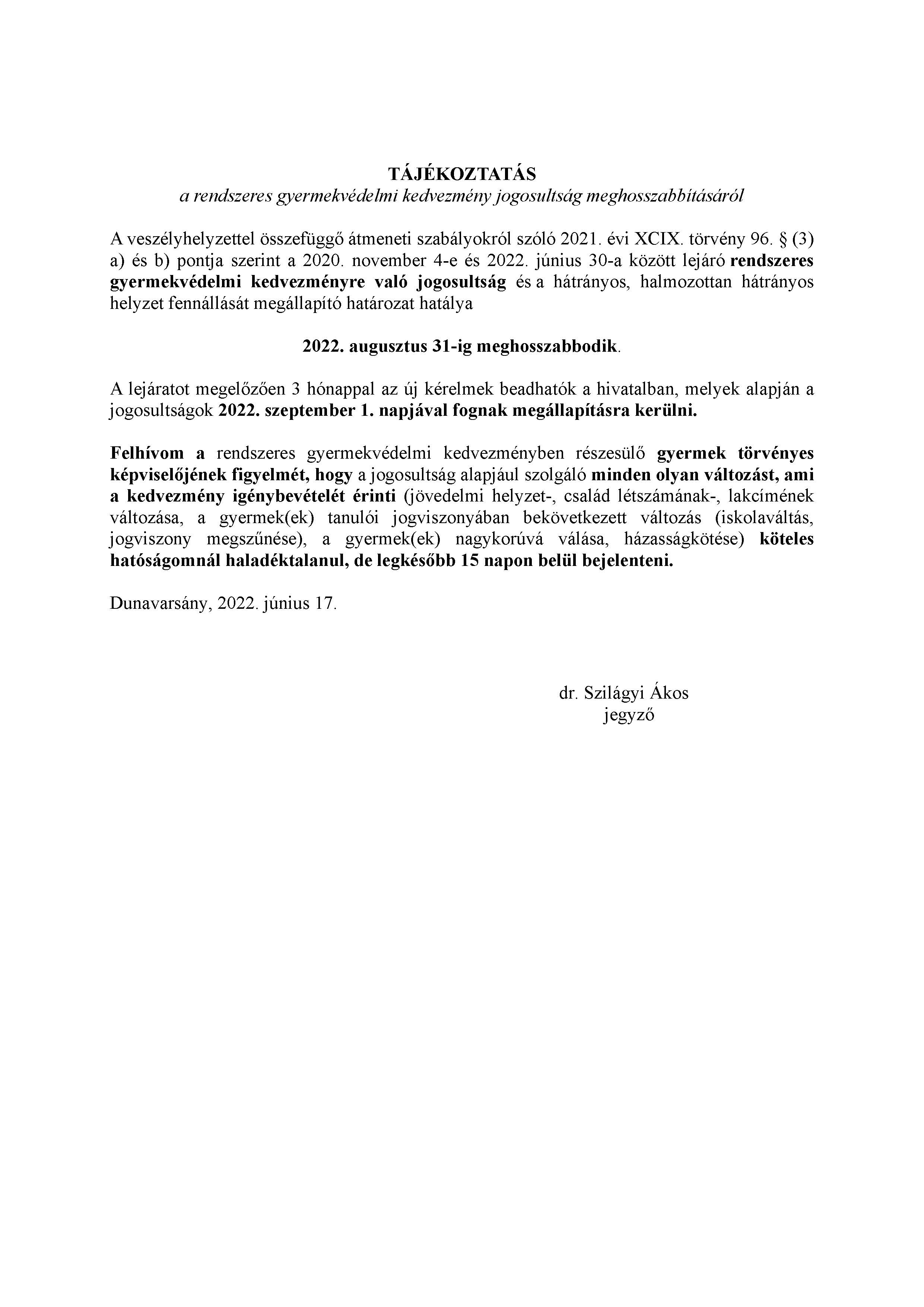 Tájékoztatás a rendszeres gyermekvédelmi kedvezmény jogosultság meghosszabbításáról - 2022.08.31.
