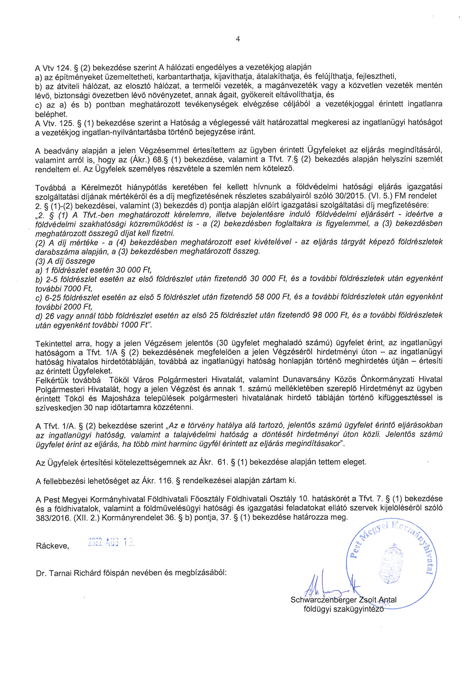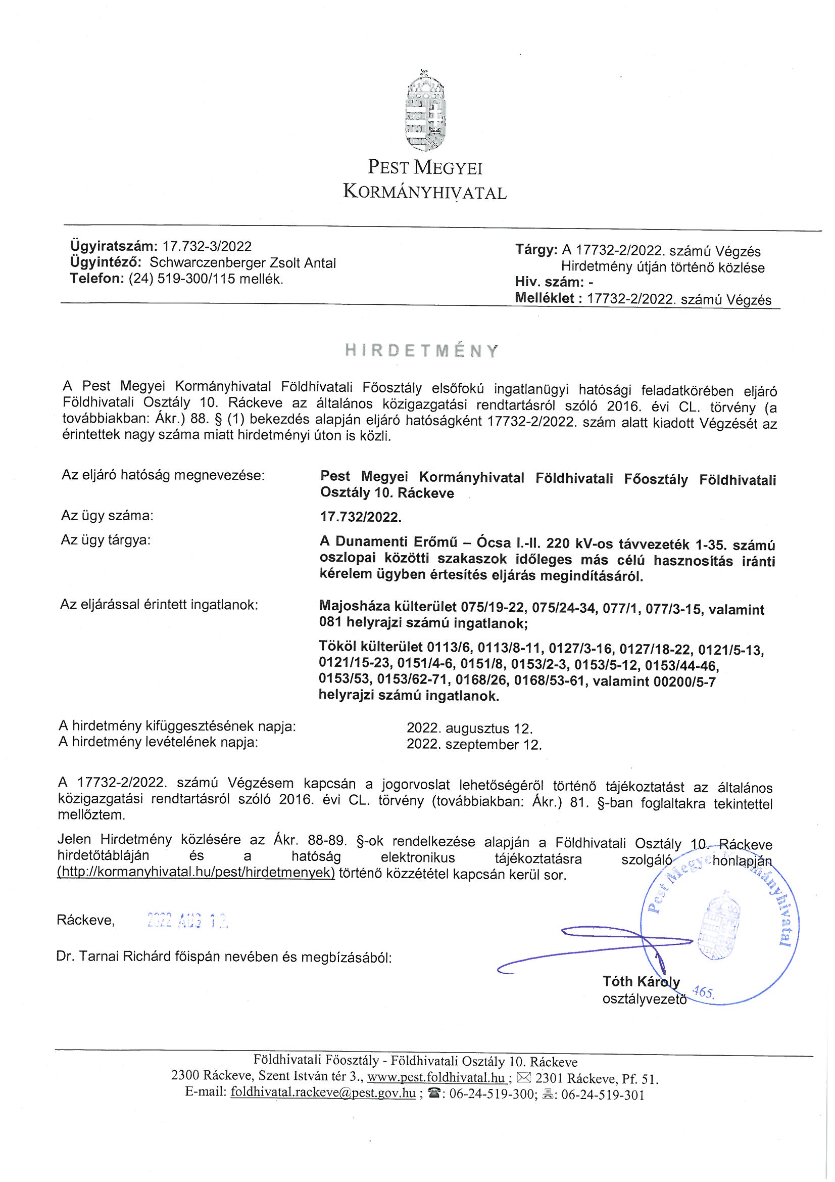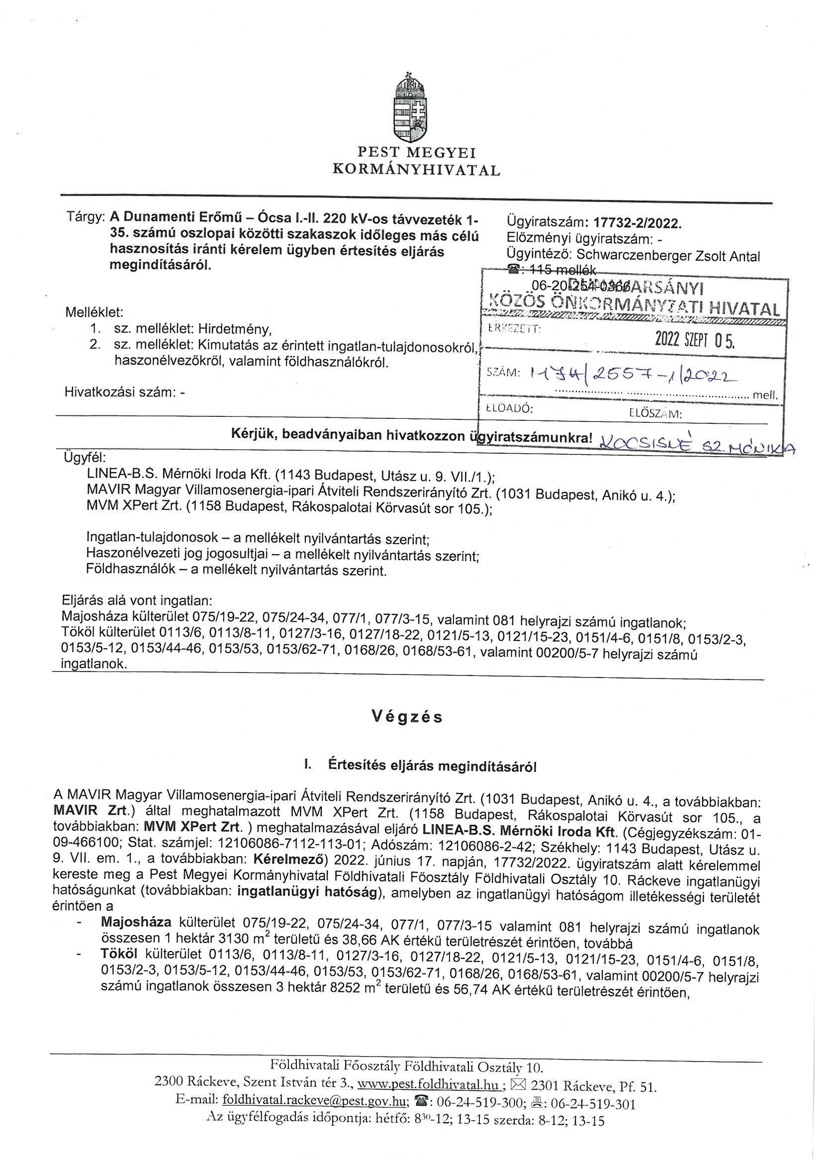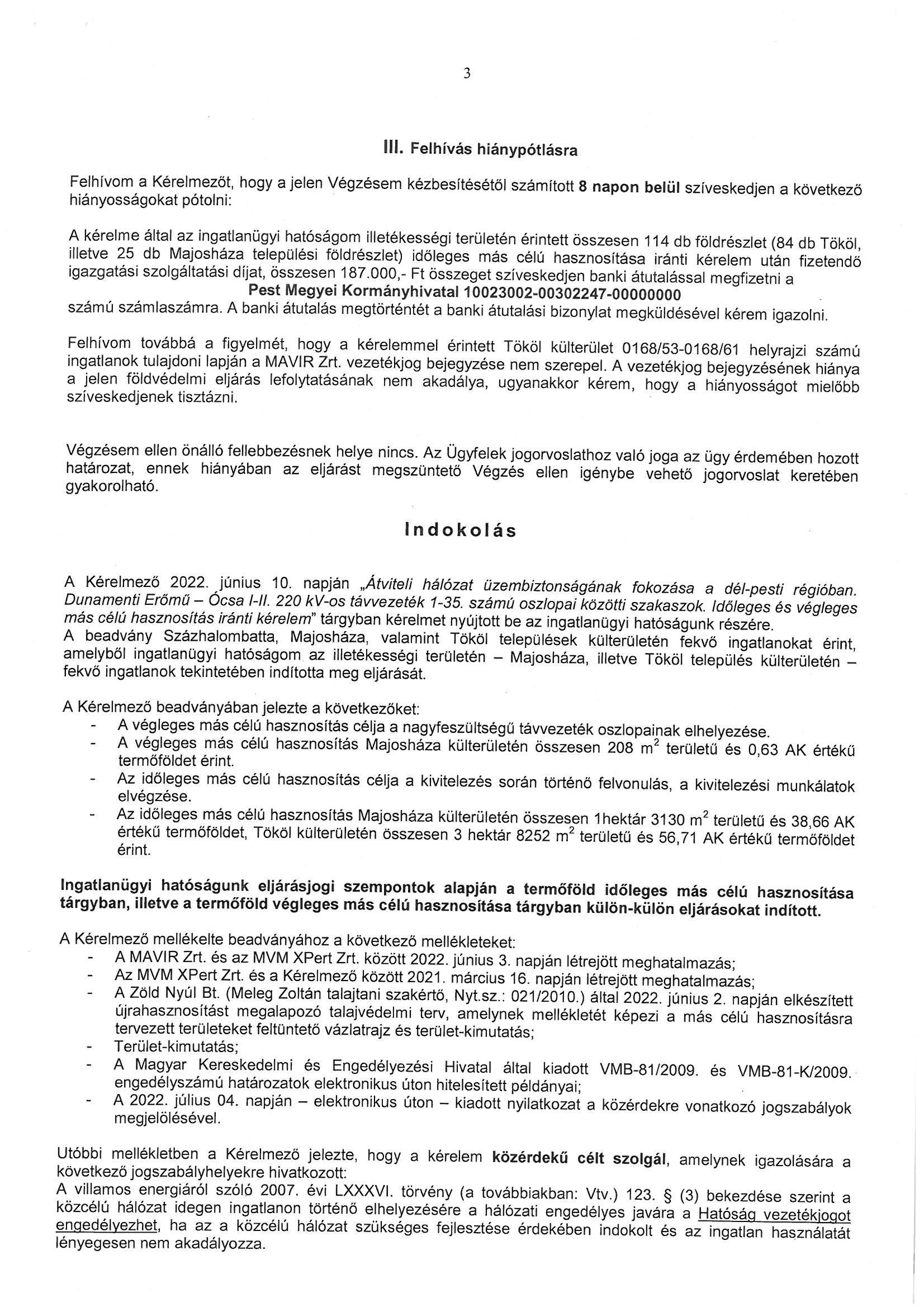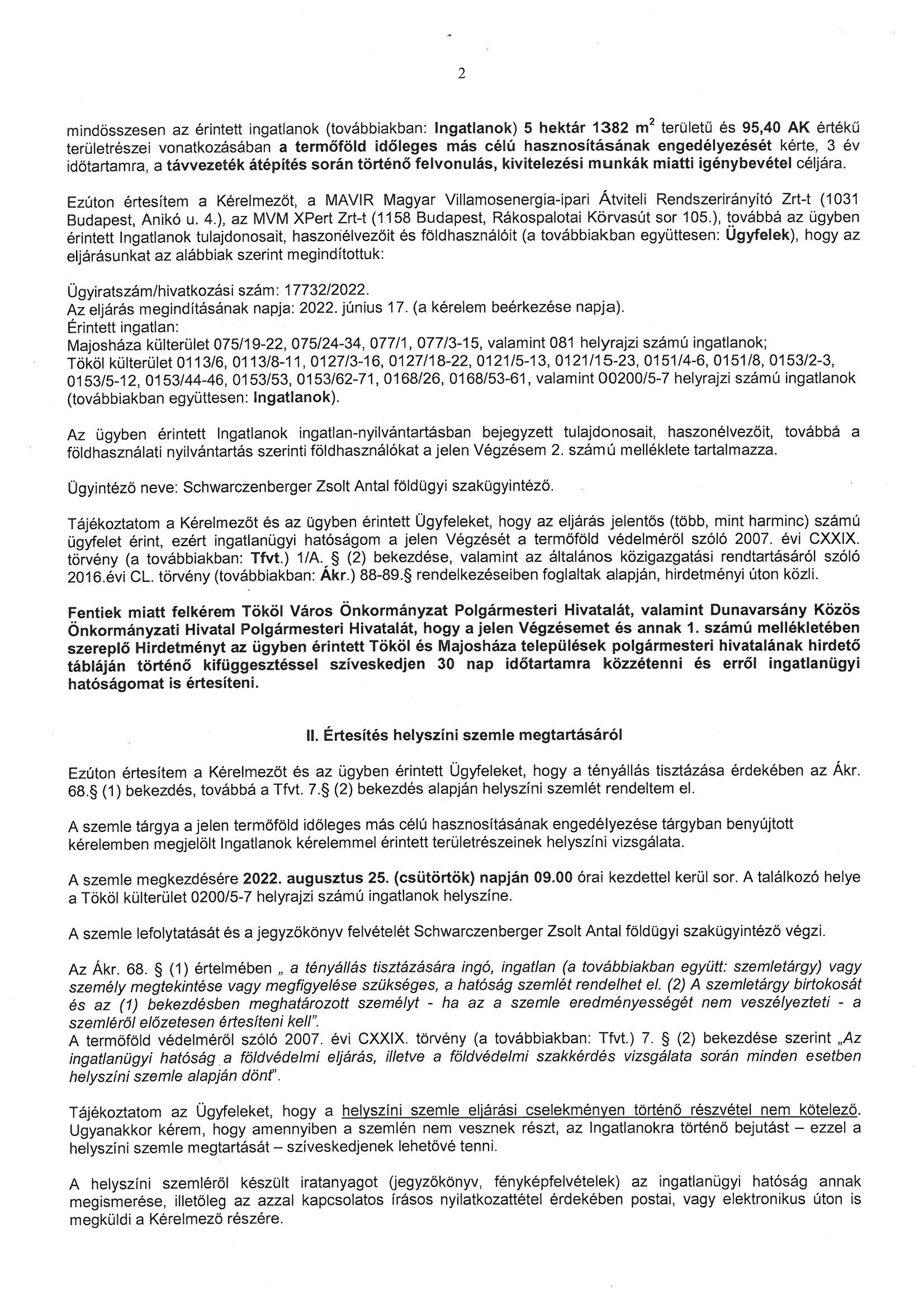 Végzés, hirdetmény - A Dunamenti Erőmű - Ócsa I.-II. 220 kV-os távvezeték 1-35. számú oszlopai közötti szakaszok időleges más célú hasznosítás iránti kérelem ügyben értesítés eljárás megindításáról