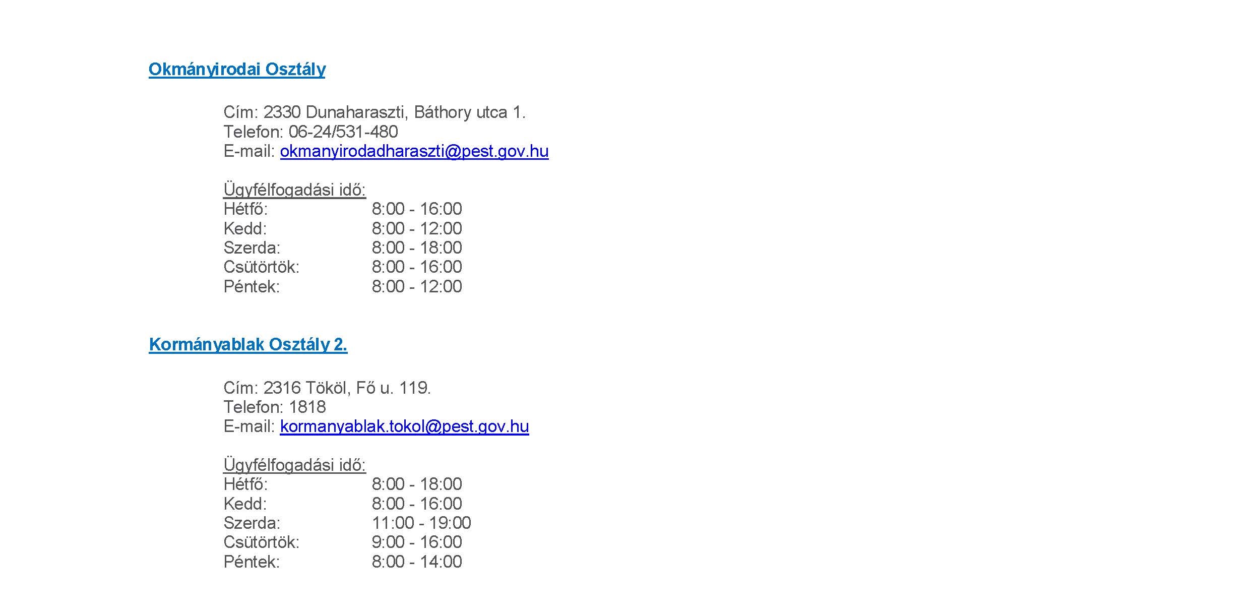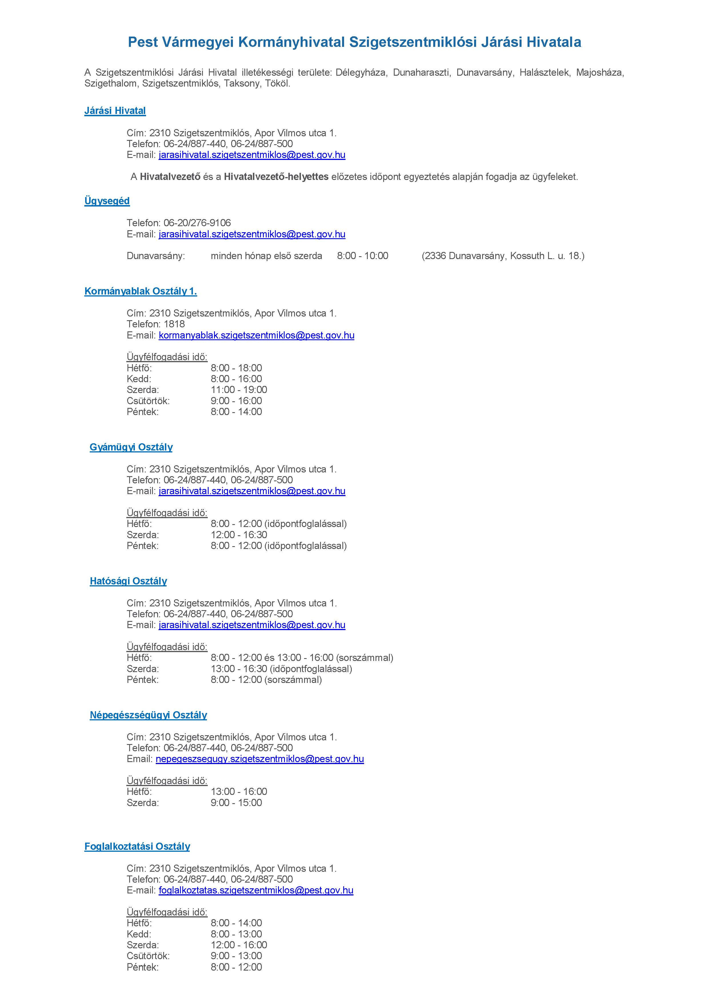 Pest Vármegyei Kormányhivatal Szigetszentmiklósi Járási Hivatal új ügyfélfogadási rendje