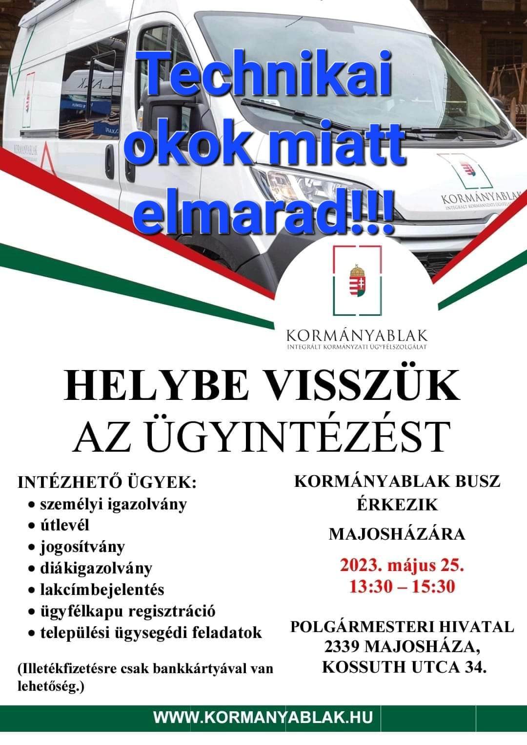ELMARAD! Kormányablak busz Majosházán 2023.05.25., 13:30-15:30
