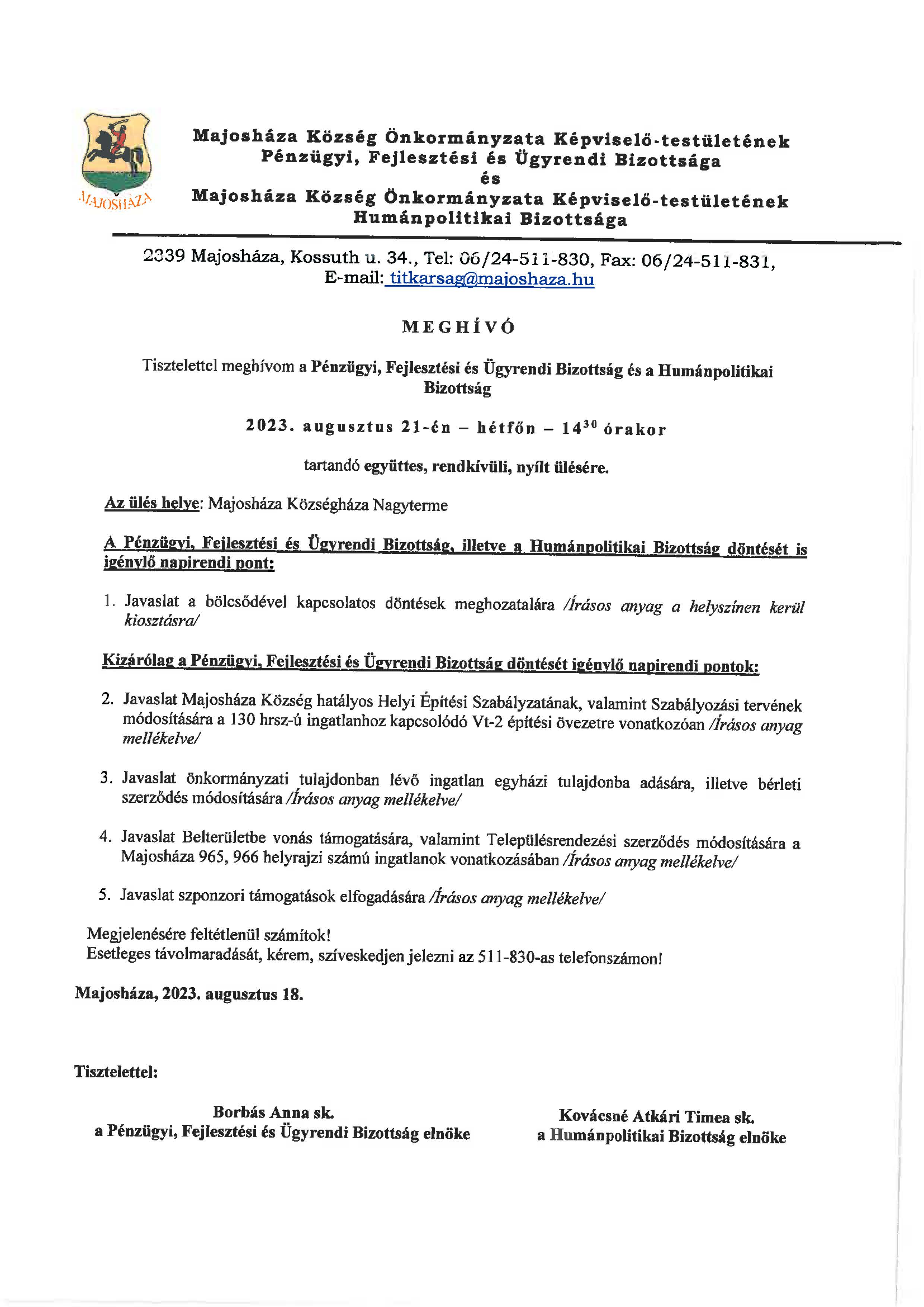 Pénzügyi, Fejlesztési és Ügyrendi Bizottság és Humánpolitikai Bizottsági együttes ülés - 2023.08.21.