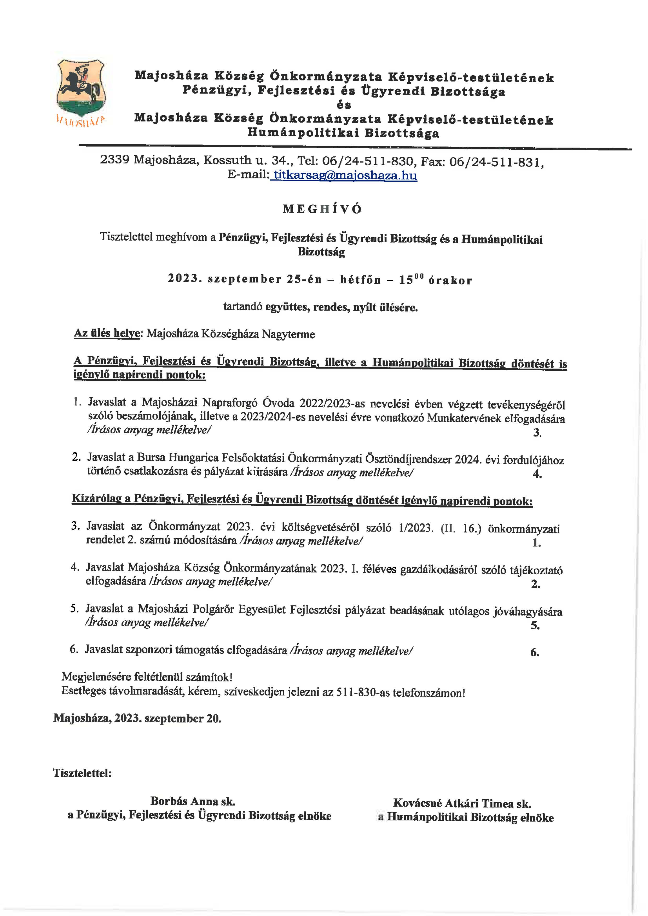 Pénzügyi, Fejlesztési és Ügyrendi Bizottság és Humánpolitikai Bizottsági együttes ülés - 2023.09.25.