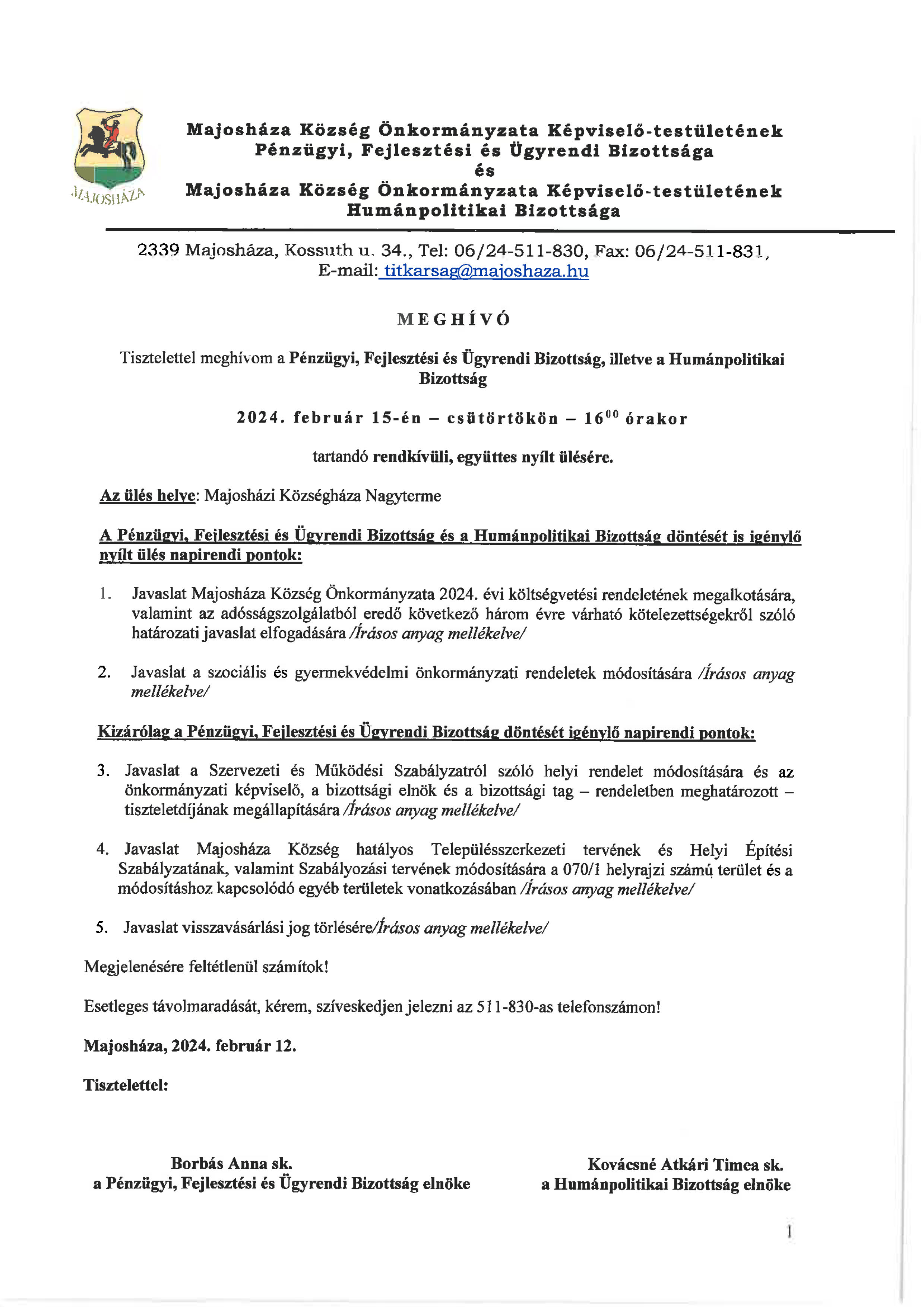 Pénzügyi, Fejlesztési és Ügyrendi Bizottság és Humánpolitikai Bizottsági együttes ülés - 2024. 02. 15.