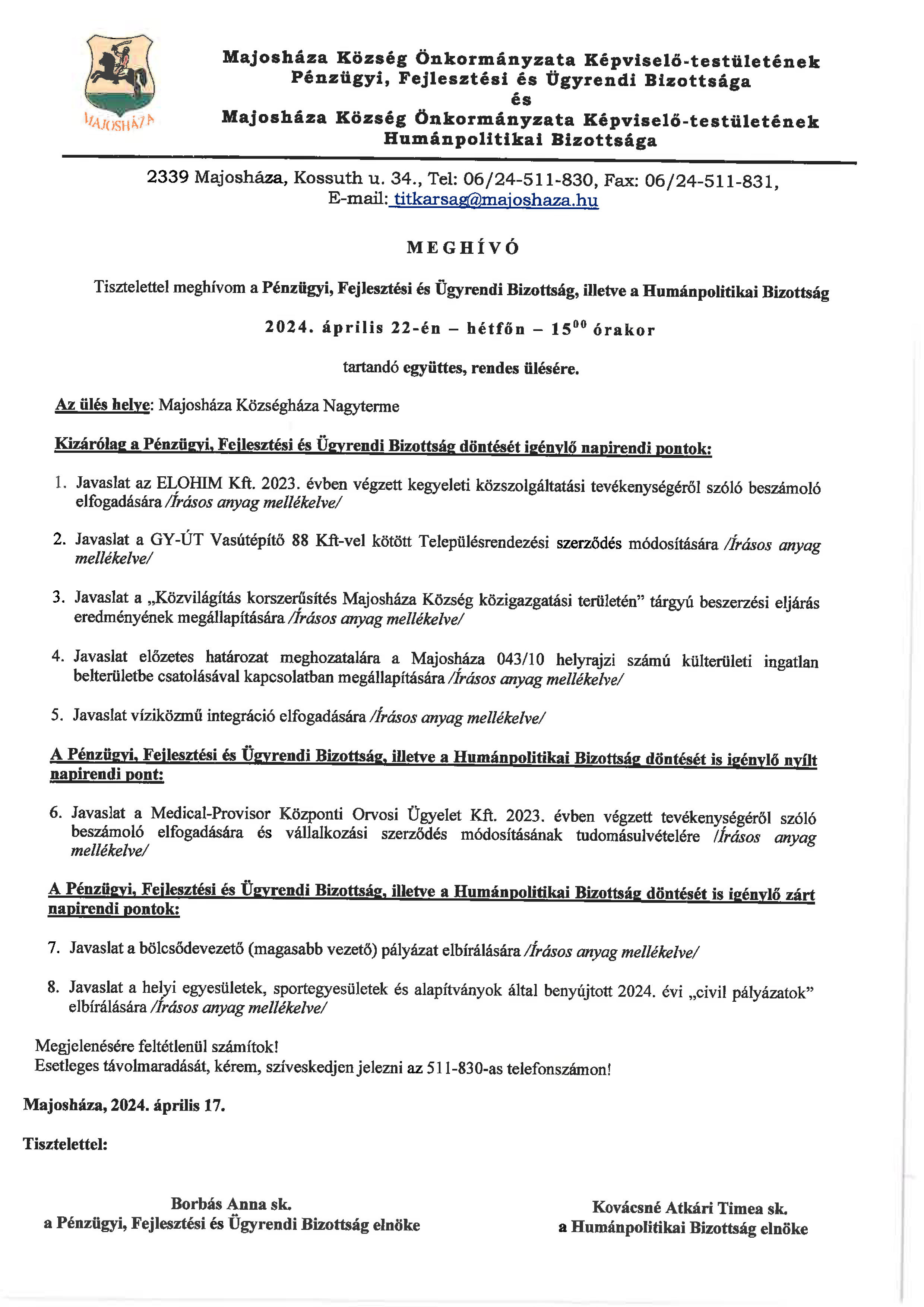 Pénzügyi, Fejlesztési és Ügyrendi Bizottság és Humánpolitikai Bizottsági együttes ülés - 2024. 04. 22.