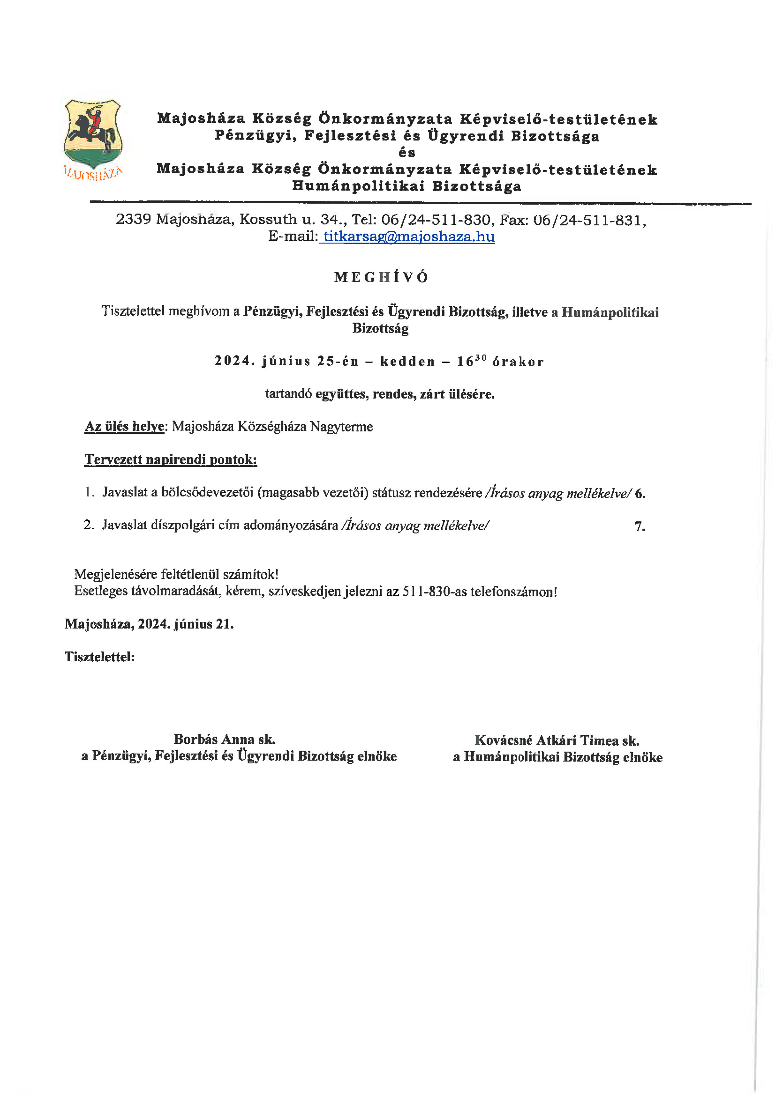 Pénzügyi, Fejlesztési és Ügyrendi Bizottság és Humánpolitikai Bizottsági együttes ülés - 2024. 06. 25.