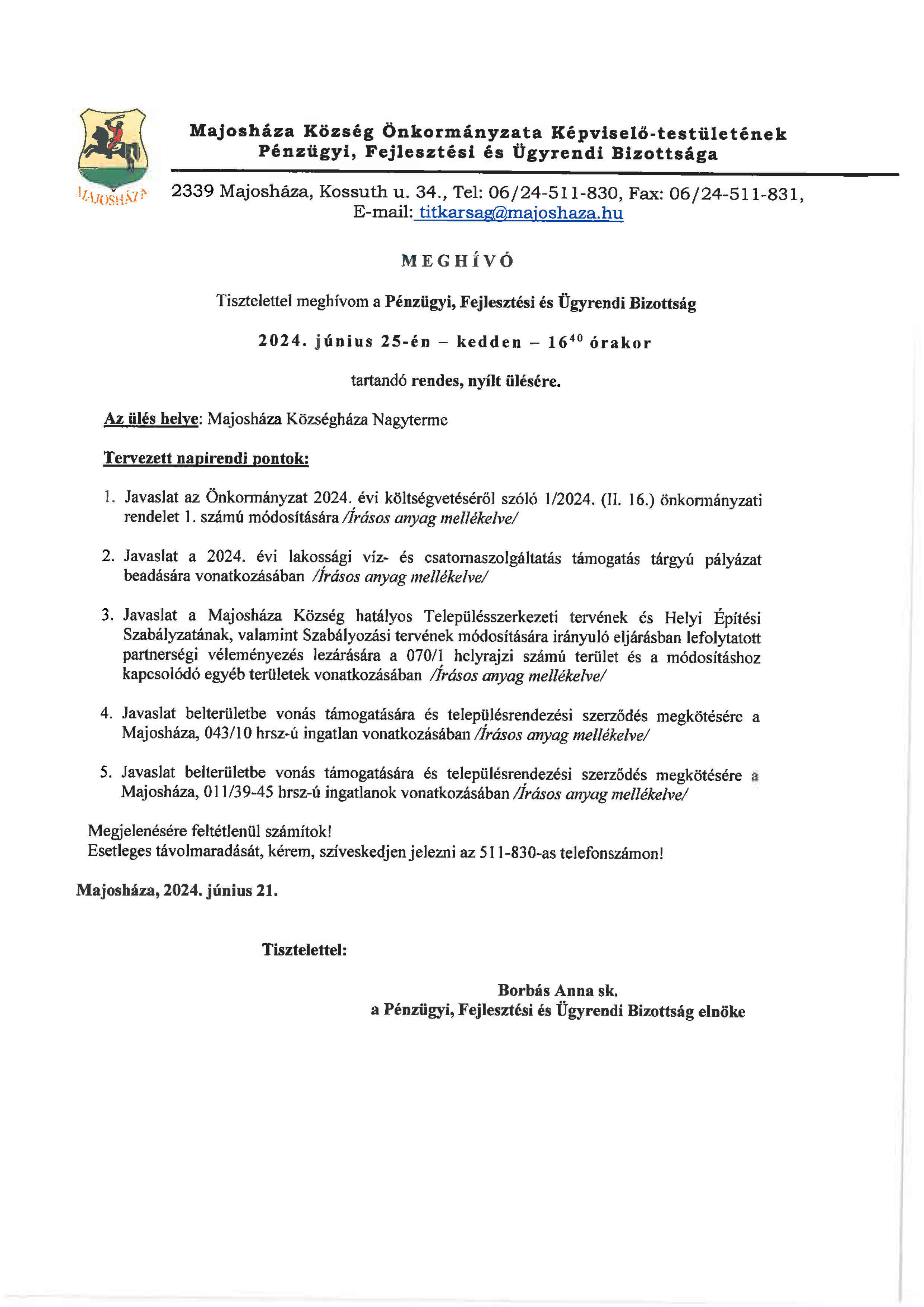 Pénzügyi, Fejlesztési és Ügyrendi Bizottság ülés - 2024. 06. 25.