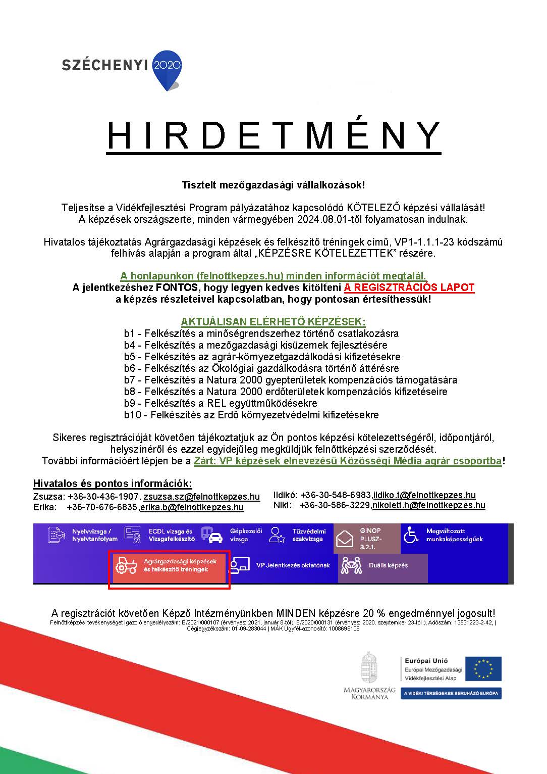 Hirdetmény - Agrárgazdasági képzések és felkészítő tréningek