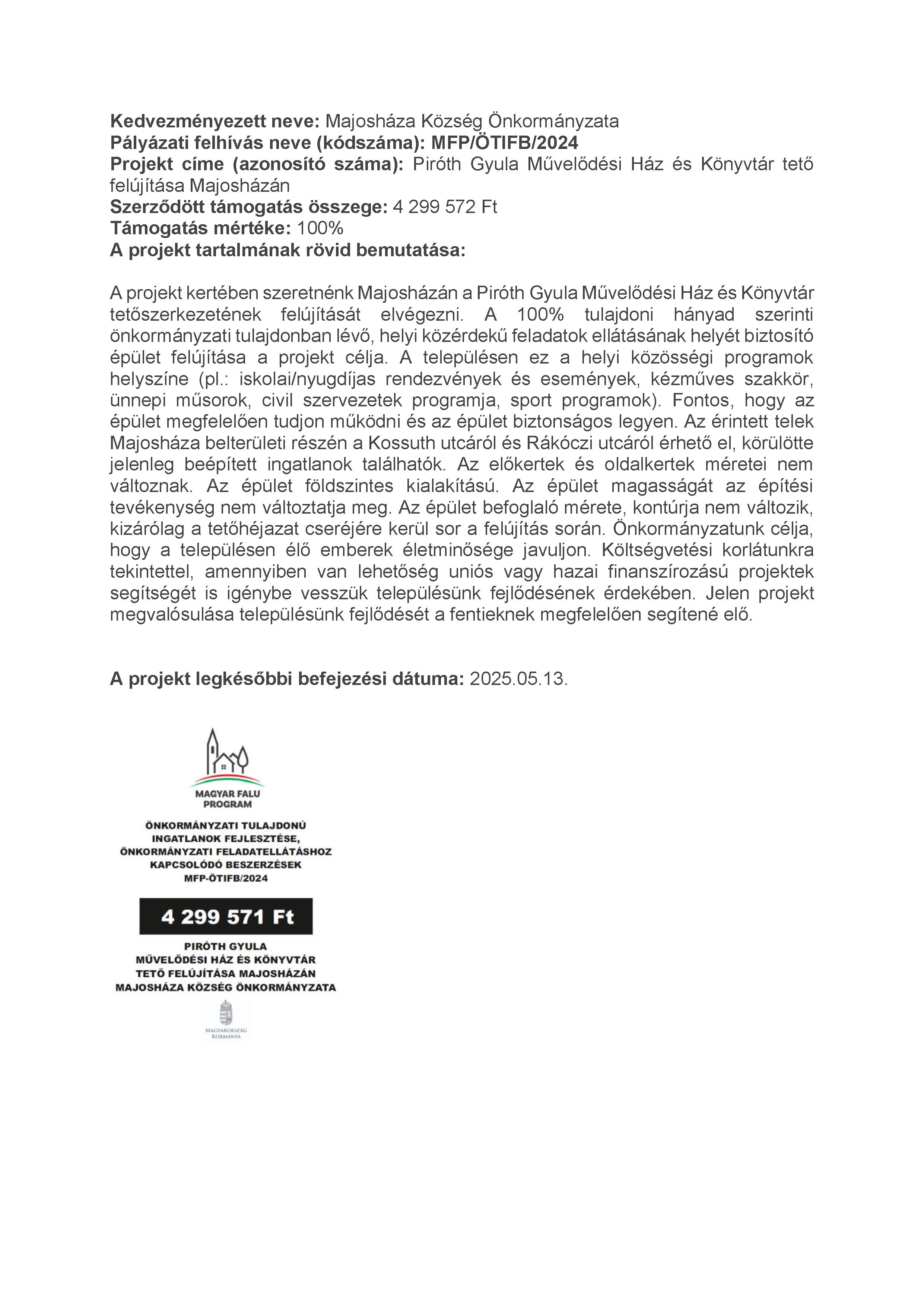 Magyar Falu Program - Piróth Gyula Művelődési Ház és Könyvtár tető felújítása Majosházán