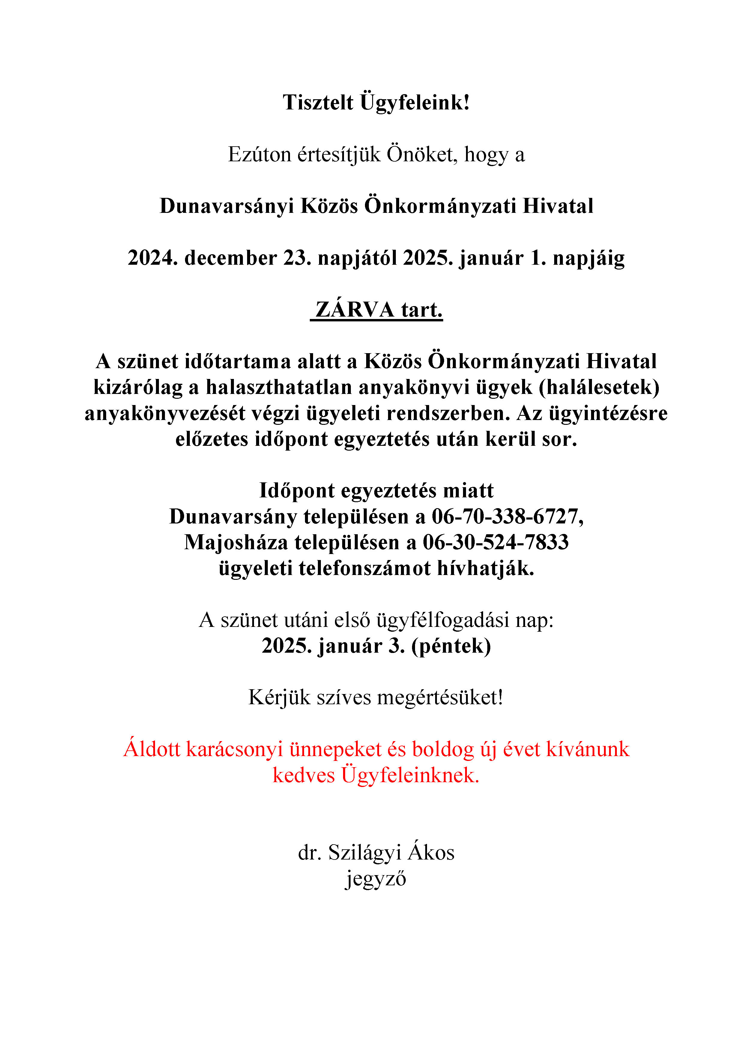 A Dunavarsányi Közös Önkormányzati Hivatal 2024. december 23. és 2025. január 1. között zárva tart
